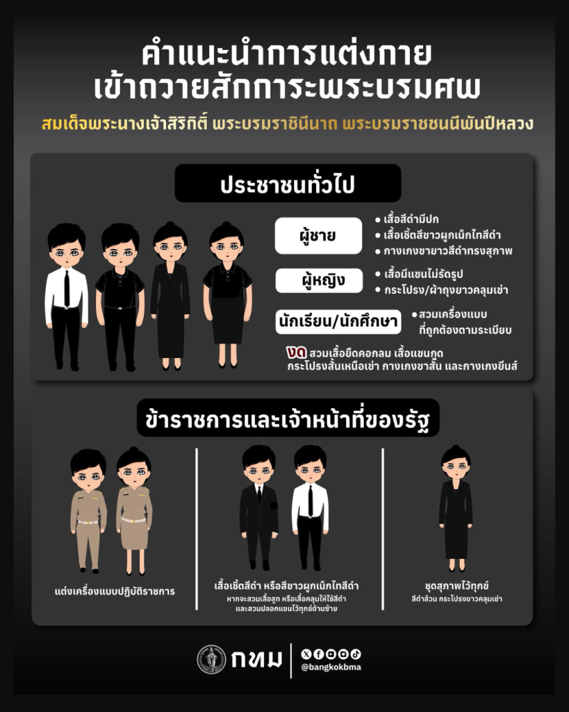 กรุงเทพมหานคร แนะนำการแต่งกายเข้าถวายสักการะพระบรมศพ สมเด็จพระนางเจ้าสิริกิติ์ พระบรมราชินีนาถ พระบรมราชชนนีพันปีหลวง ณ ศาลาหทัยสมาคม พระบรมมหาราชวัง