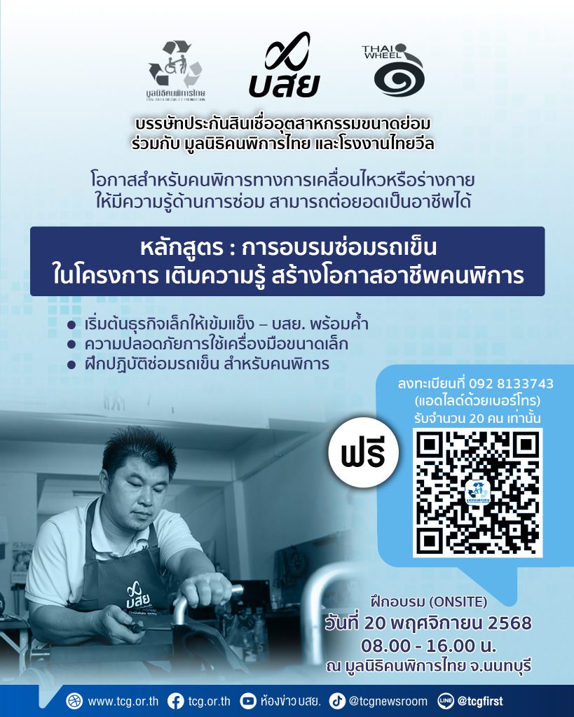 บรรษัทประกันสินเชื่ออุตสาหกรรมขนาดย่อม (บสย.) ร่วมกับมูลนิธิคนพิการไทย และโรงงานไทยวีล. ขอเชิญคนพิการทางการเคลื่อนไหวหรือร่างกาย ร่วมอบรมหลักสูตรซ่อมรถเข็น ฟรี! ไม่มีค่าใช้จ่าย