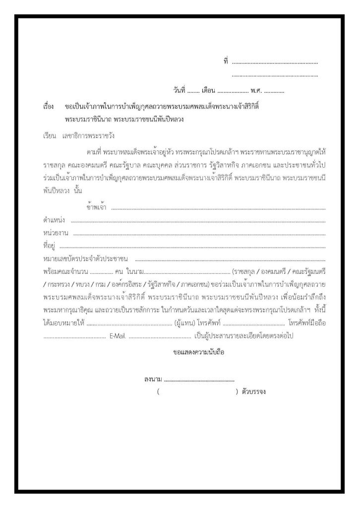 สามารถดาวน์โหลดตัวอย่างหนังสือขอเป็นเจ้าภาพในการบำเพ็ญกุศลถวายพระบรมศพ สมเด็จพระนางเจ้าสิริกิติ์ พระบรมราชินีนาถ พระบรมราชชนนีพันปีหลวง ได้ที่ www.royaloffice.th