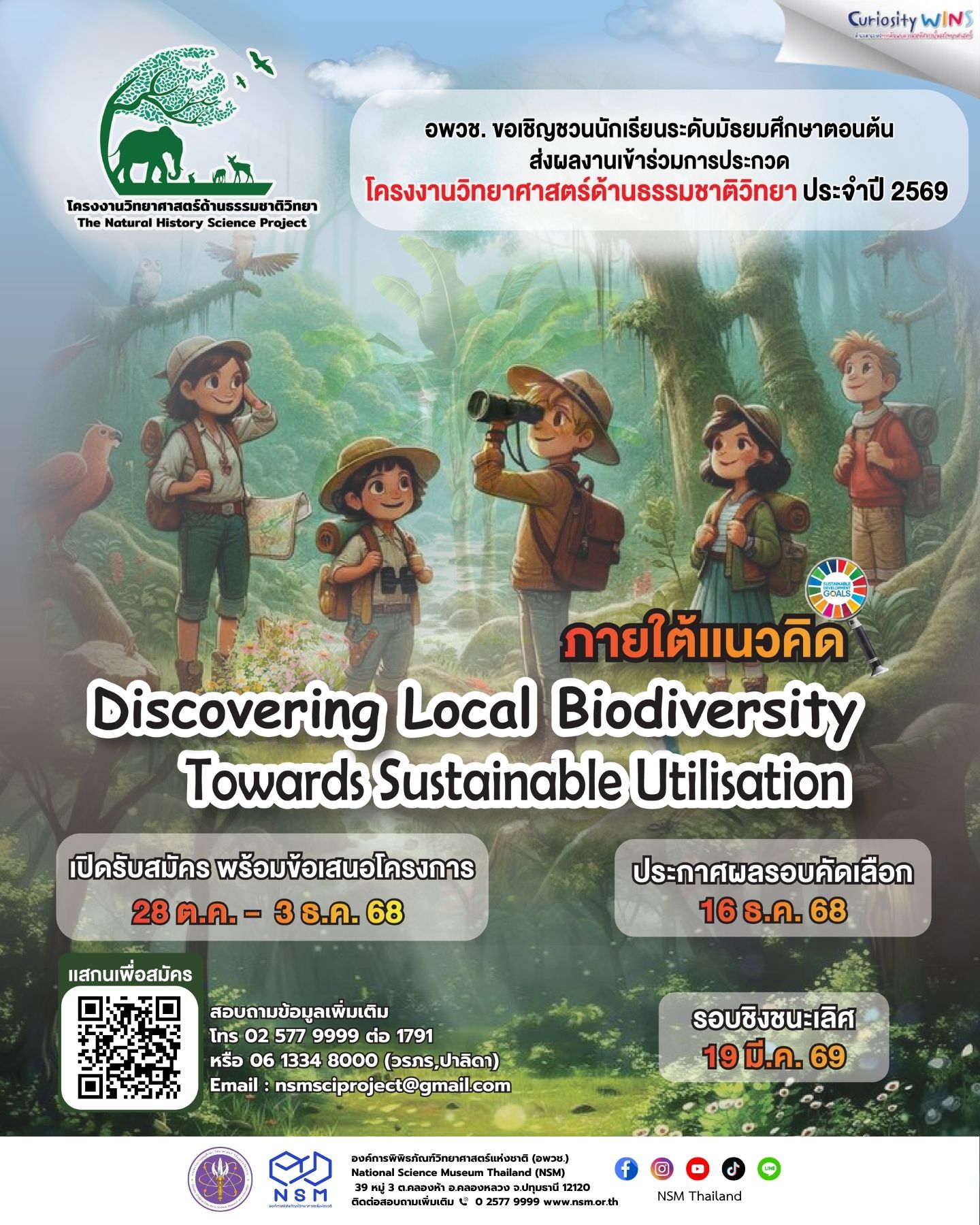 องค์การพิพิธภัณฑ์วิทยาศาสตร์แห่งชาติ  เชิญชวนน้อง ๆ ระดับมัธยมศึกษาตอนต้นหรือเทียบเท่า ร่วมสำรวจความหลากหลายทางชีวภาพในท้องถิ่นของตนเอง โดยไม่เน้นการทดลองและส่งผลงานผ่านการประกวดโครงงานวิทยาศาสตร์ด้านธรรมชาติวิทยา ประจำปี 2569 ภายใต้หัวข้อ “ Discovering local biodiversity: Towards Sustainable Utilisation“ ชิงทุนการศึกษามูลค่ากว่า 50,000 บาท พร้อมโล่เกียรติยศ โดย 40 ทีม ที่ผ่านการคัดเลือกจะได้เข้าร่วมนำเสนอผลงานในรอบชิงชนะเลิศ ระดับประเทศ ณ NSM คลองห้า ปทุมธานี