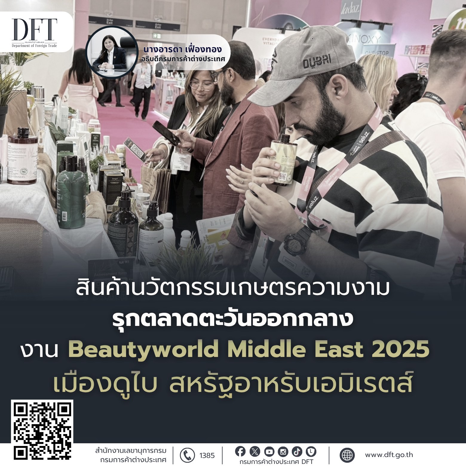 กรมการค้าต่างประเทศ ร่วมงาน Beautyworld Middle East 2025 งานแสดงสินค้าเครื่องสำอางและความงามที่ยิ่งใหญ่ที่สุดในตะวันออกกลาง จัดขึ้นระหว่าง วันที่ 27 – 29 ตุลาคม 2568 ณ บูธ SA-D20 Dubai World Trade Centre เมืองดูไบ สหรัฐอาหรับเอมิเรตส์ เพื่อประกาศศักยภาพของสินค้าเกษตรนวัตกรรมไทยบนเวทีระดับโลก ซึ่งได้คัดสรรผลิตภัณฑ์เกษตรนวัตกรรมกว่า 45 รายการจาก 16 บริษัทผู้ประกอบการชั้นนำของไทย ยกระดับคุณภาพสินค้าไทยให้สามารถแข่งขันได้ในตลาดโลก โดยเฉพาะในภูมิภาคตะวันออกกลาง ซึ่งมีศักยภาพสูงและมีกำลังซื้อสูงมากในกลุ่มผลิตภัณฑ์ความงามจากธรรมชาติ
