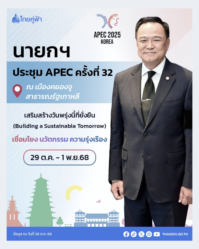 นายอนุทิน ชาญวีรกูล นายกรัฐมนตรีและรัฐมนตรีว่าการกระทรวงมหาดไทย มีกำหนดเยือนสาธารณรัฐเกาหลี ณ เมืองคยองจู ระหว่างวันที่ 29 ตุลาคม – 1 พฤศจิกายน 2568 เพื่อเข้าร่วมการประชุมผู้นำเขตเศรษฐกิจเอเปค ครั้งที่ 32 จัดขึ้นภายใต้หัวข้อหลัก “เสริมสร้างวันพรุ่งนี้ที่ยั่งยืน” (Building a Sustainable Tomorrow) ผ่าน 3 แนวคิดสำคัญ ได้แก่ “เชื่อมโยง-นวัตกรรม-ความรุ่งเรื่องร่วมกัน” (Connect, Innovate, Prosper) และการประชุมอื่น ๆ ที่เกี่ยวข้อง