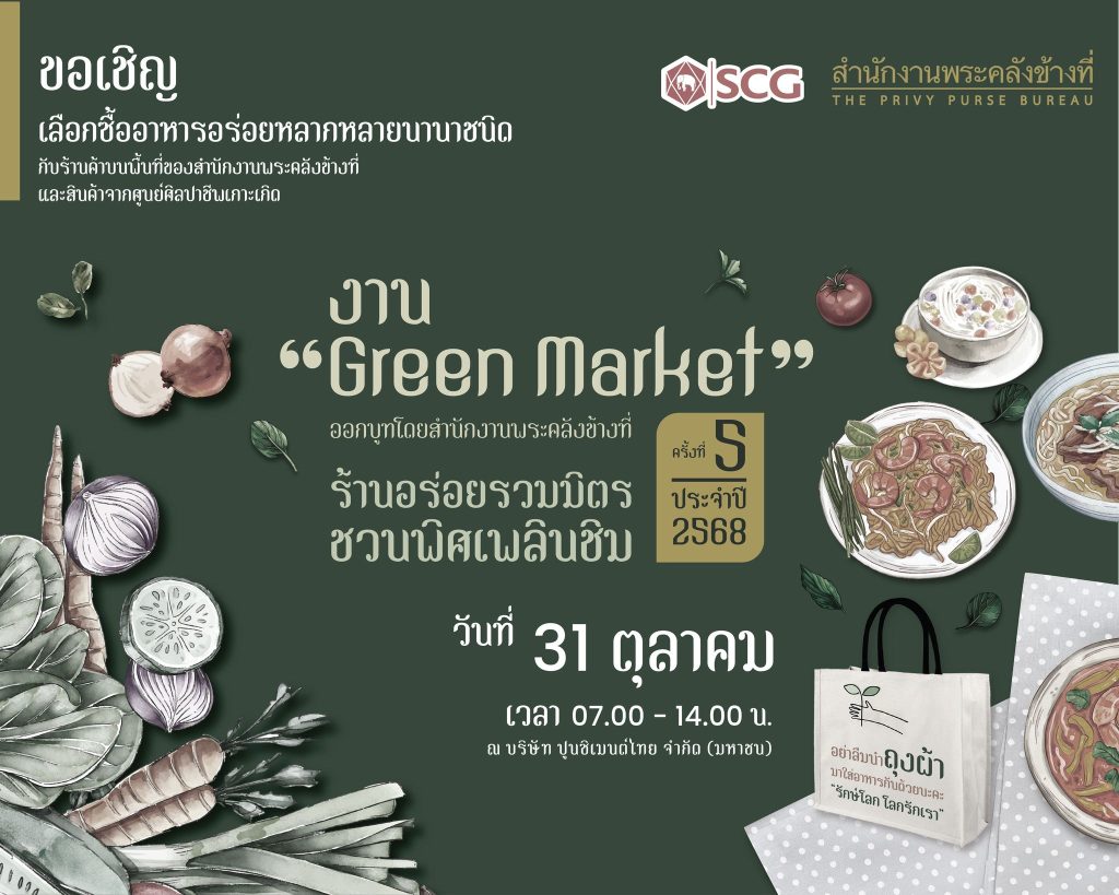 สำนักงานพระคลังข้างที่ ร่วมกับ บริษัท ปูนซิเมนต์ไทย จำกัด (มหาชน) ขอเชิญเลือกซื้ออาหารอร่อยหลากหลายนานาชนิด และสินค้าจากศูนย์ศิลปาชีพเกาะเกิด ในงาน “Green Market” ครั้งที่ 5 ประจำปี 2568 วันที่ 31 ตุลาคม 2568 เวลา 07.00 – 14.00 น. ณ บริษัท ปูนซิเมนต์ไทย จำกัด (มหาชน)