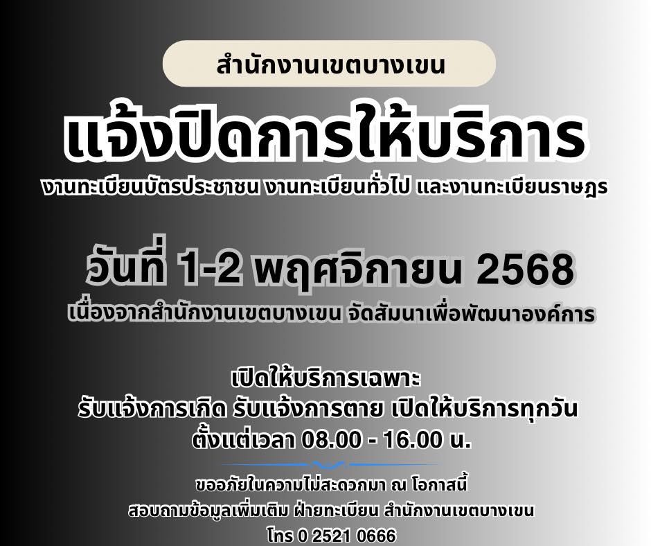 สำนักงานเขตบางเขน แจ้งปิดให้บริการงานทะเบียนราษฎรและงานทะเบียนบัตรประจำตัวประชาชน ในวันเสาร์ที่ 1 และ วันอาทิตย์ที่ 2 พฤศจิกายน 2568 เนื่องจากสำนักงานเขตบางเขน จัดสัมมนาเพื่อพัฒนาองค์การให้กับช้าราชการและบุคลากร ทั้งนี้ เปิดบริการเฉพาะ แจ้งเกิด แจ้งตาย เวลา 08.00-16.00 น. สอบถามข้อมูลเพิ่มเติม โทร. 0 2521 0666