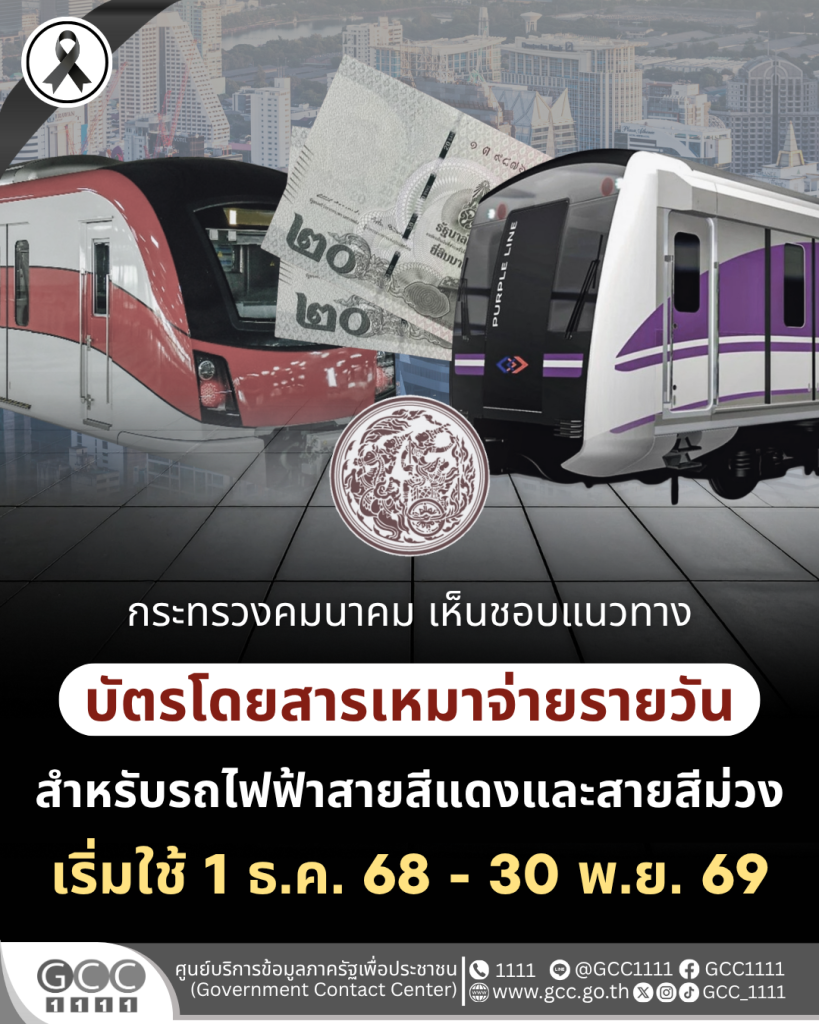 กระทรวงคมนาคม เห็นชอบแนวทาง “บัตรโดยสารเหมาจ่ายรายวัน” สำหรับรถไฟฟ้าสายสีแดงและสายสีม่วง เริ่มใช้ 1 ธันวาคม 2568 – 30 พฤศจิกายน 2569 เพื่อให้ประชาชนเดินทางได้สะดวก คุ้มค่า และลดค่าใช้จ่าย