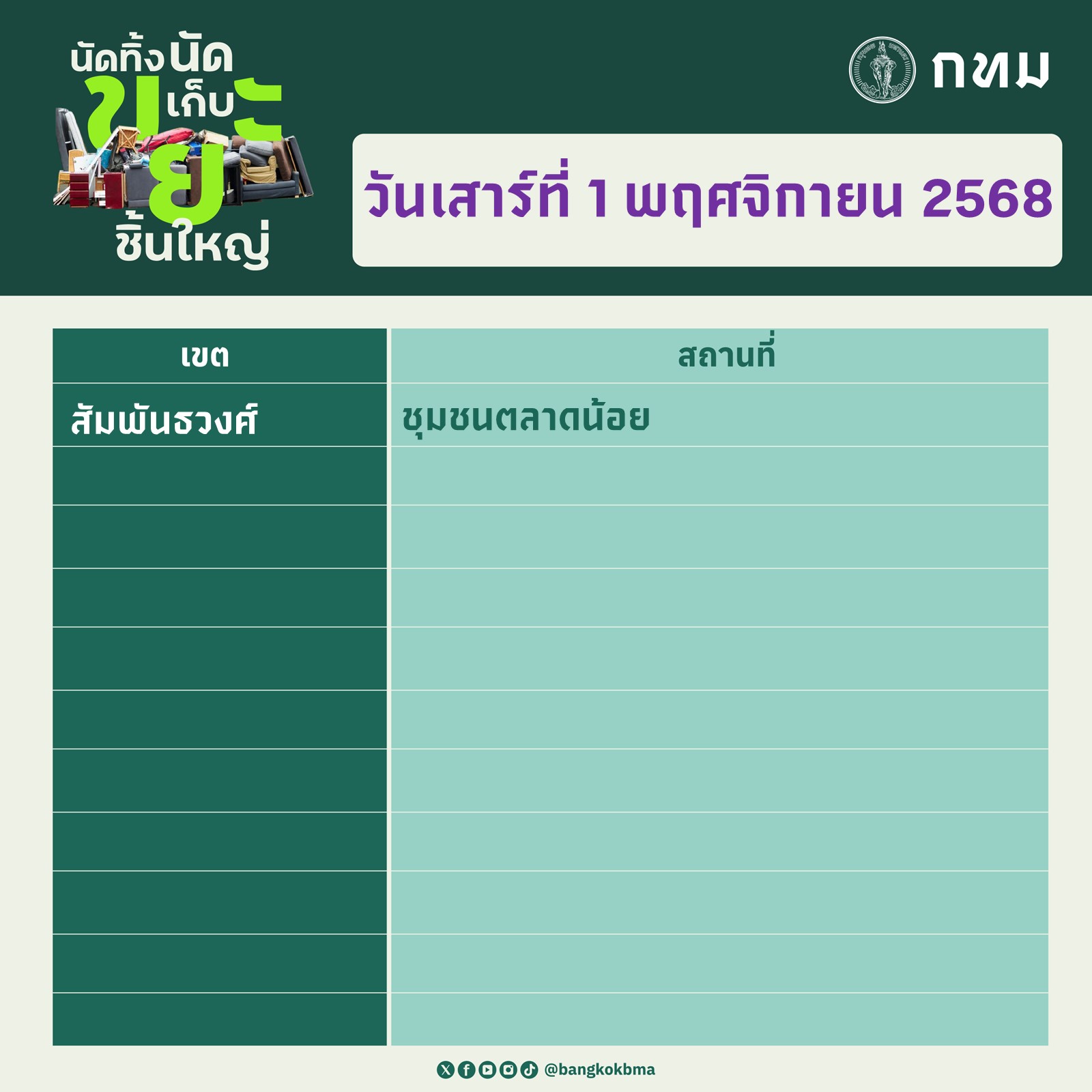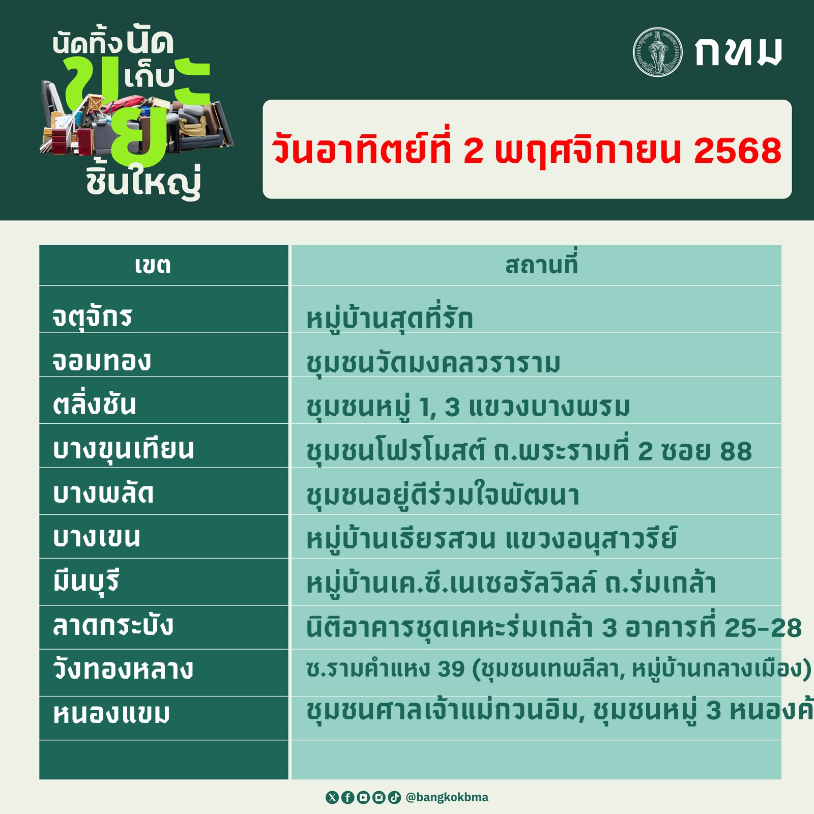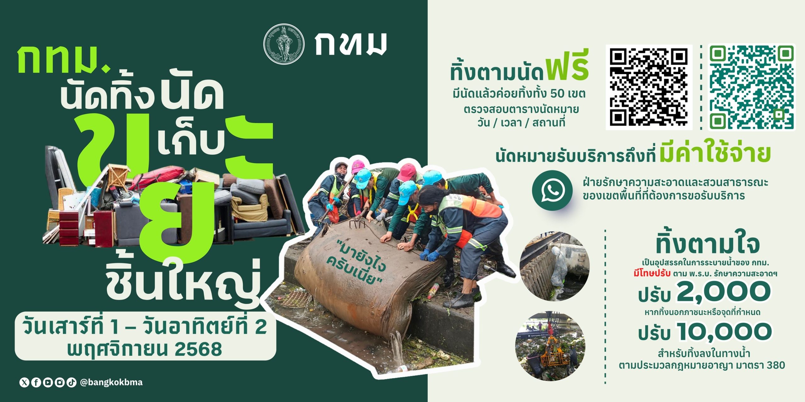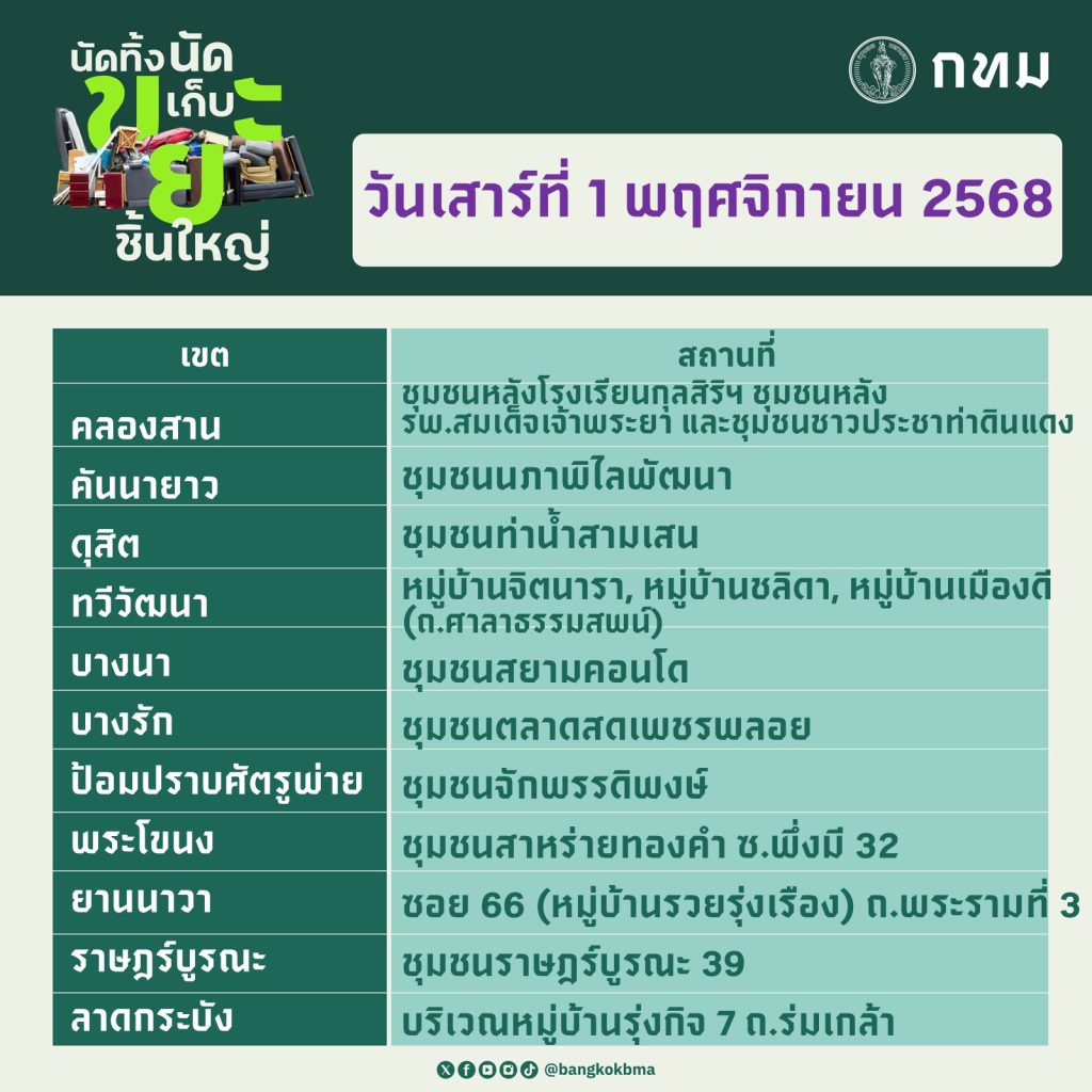 กรุงเทพมหานคร นัดทิ้ง นัดเก็บ ขยะชิ้นใหญ่ ในวันเสาร์ที่ 1 พฤศจิกายน 2568 และวันอาทิตย์ที่ 2 พฤศจิกายน 2568 ตั้งแต่เวลา 09.00 – 12.00 น. ทุกสำนักงานเขตให้บริการฟรี โดยไม่มีค่าใช้จ่าย ขอความร่วมมือนำขยะชิ้นใหญ่และสิ่งของเหลือใช้ออกมาทิ้ง ณ บริเวณจุดพักขยะหน้าบ้านพักอาศัยก่อนเวลา 08.30 น.