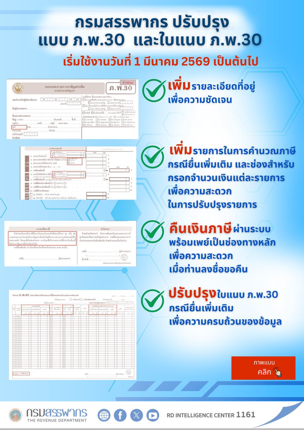 กรมสรรพากร ปรับปรุงแบบแสดงรายการภาษีมูลค่าเพิ่ม ตามประมวลรัษฎากร (ภ.พ.30) และใบแนบ ภ.พ.30 เริ่มใช้งานวันที่ 1 มีนาคม 2569 เป็นต้นไป คลิกเพื่อดูภาพแบบ