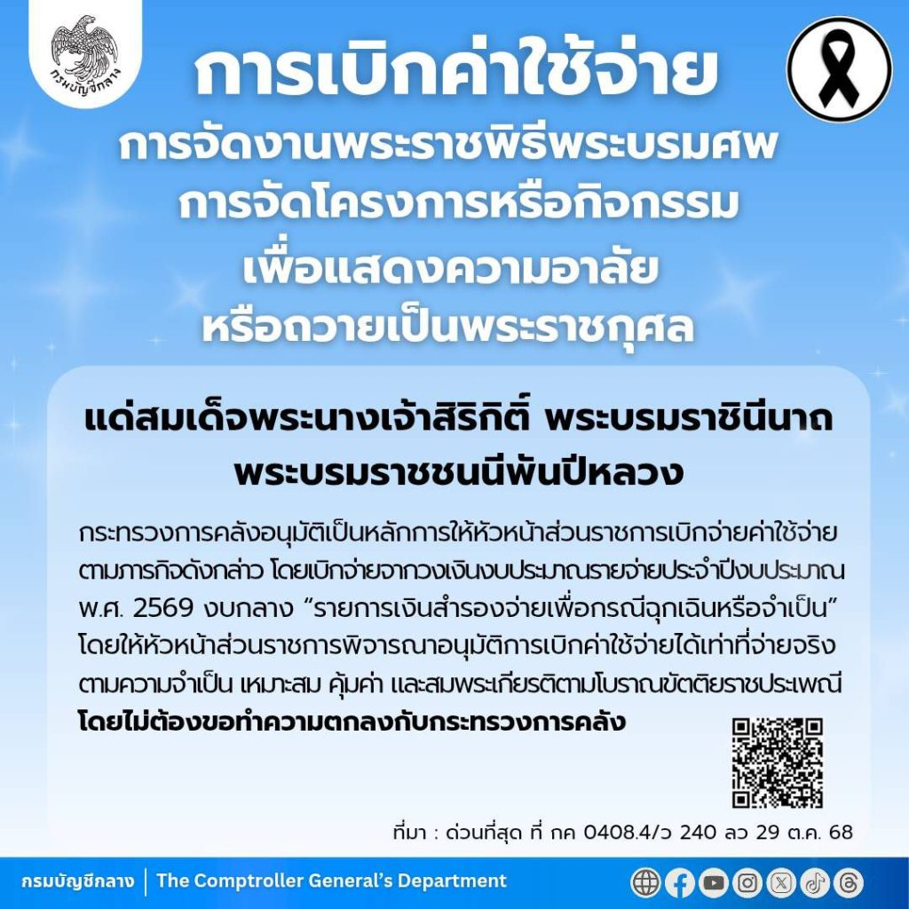 กระทรวงการคลัง อนุมัติหลักการเบิกจ่ายงบฯ จัดงานพระราชพิธีถวายพระเพลิงพระบรมศพ “สมเด็จพระพันปีหลวง” ข่าวสารกิจกรรม, สมเด็จพระบรมราชชนนีพันปีหลวง กระทรวงการคลัง อนุมัติหลักการเบิกจ่ายงบฯ จัดงานพระราชพิธีถวายพระเพลิงพระบรมศพ “สมเด็จพระพันปีหลวง” กรมบัญชีกลาง เปิดเผยกระทรวงการคลังอนุมัติในหลักการให้ส่วนราชการสามารถเบิกจ่ายค่าใช้จ่าย ในการจัดงานพระราชพิธีถวายพระเพลิงพระบรมศพ การจัดโครงการ หรือกิจกรรมเพื่อแสดงความอาลัย และถวายเป็นพระราชกุศลแด่สมเด็จพระนางเจ้าสิริกิติ์ พระบรมราชินีนาถ พระบรมราชชนนีพันปีหลวง กรมบัญชีกลาง กระทรวงการคลัง เปิดเผยว่า กระทรวงการคลังได้อนุมัติในหลักการให้ส่วนราชการสามารถเบิกจ่ายค่าใช้จ่ายในการจัดงานพระราชพิธีถวายพระเพลิงพระบรมศพ การจัดโครงการ หรือกิจกรรมเพื่อแสดงความอาลัย หรือถวายเป็นพระราชกุศลแด่ สมเด็จพระนางเจ้าสิริกิติ์ พระบรมราชินีนาถ พระบรมราชชนนีพันปีหลวง ได้ตามภารกิจที่เกี่ยวข้อง ทั้งนี้ ให้ส่วนราชการดำเนินการเบิกจ่ายจากงบประมาณรายจ่ายประจำปี พ.ศ. 2569 งบกลาง “รายการเงินสำรองจ่ายเพื่อกรณีฉุกเฉินหรือจำเป็น” โดยหัวหน้าส่วนราชการสามารถพิจารณาอนุมัติการเบิกจ่ายได้ เท่าที่จ่ายจริง ตามความจำเป็น เหมาะสม คุ้มค่า และสมพระเกียรติ ตามโบราณขัตติยราชประเพณี โดยไม่ต้องขอทำความตกลงเพิ่มเติมกับกระทรวงการคลัง ที่มา : Facebook กรมบัญชีกลาง Post Views: 32 FacebookFacebookXTwitterLINELine