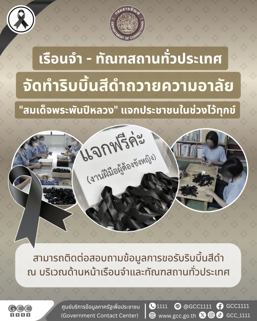 ในการนี้ กระทรวงยุติธรรม จึงขอประชาสัมพันธ์ให้ประชาชน สามารถติดต่อสอบถามข้อมูลการขอรับริบบิ้นสีดำถวายความอาลัยได้ ณ บริเวณด้านหน้าเรือนจำและทัณฑสถานทั่วประเทศ