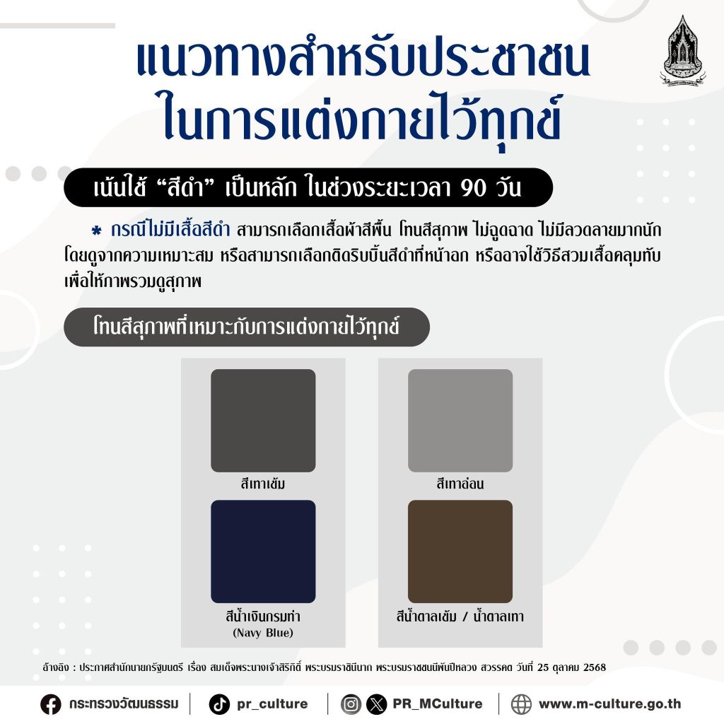 กระทรวงวัฒนธรรม แนะนำแนวทางสำหรับประชาชนในการแต่งกายไว้ทุกข์สมเด็จพระบรมราชชนนีพันปีหลวงสวรรคต ข่าวสารกิจกรรม, สมเด็จพระบรมราชชนนีพันปีหลวง กระทรวงวัฒนธรรม แนะนำแนวทางสำหรับประชาชนในการแต่งกายไว้ทุกข์สมเด็จพระบรมราชชนนีพันปีหลวงสวรรคต กระทรวงวัฒนธรรม แนะนำแนวทางสำหรับประชาชนในการแต่งกายไว้ทุกข์สมเด็จพระบรมราชชนนีพันปีหลวงสวรรคต แนวทางสำหรับประชาชนในการแต่งกายไว้ทุกข์ เน้น “สีดำ” เป็นหลักในช่วงระยะเวลา 90 วัน กรณีไม่มีเสื้อสีดำ สามารถเลือกเสื้อผ้าสีพื้น โทนสีสุภาพ ไม่ฉูดฉาด ไม่มีลวดลายมากนัก โดยดูจากความเหมาะสม หรือสามารถเลือกติดริบบิ้นสีดำที่หน้าอก หรืออาจใช้วิธีสวมเสื้อคลุมทับ เพื่อให้ภาพรวมดูสุภาพ สามารถเลือกโทนสีสุภาพเหมาะสมกับการแต่งกายไว้ทุกข์ เช่นสีเทาเข้ม / สีเทาอ่อนสีน้ำเงินกรมท่า (Navy Blue)สีน้ำตาลเข้ม / น้ำตาลเทาอ้างอิง :ประกาศสำนักนายกรัฐมนตรี เรื่อง สมเด็จพระนางเจ้าสิริกิติ์ พระบรมราชินีนาก พระบรมราชชนนีพันปีหลวง สวรรคต วันที่ 25 ตุลาคม 2568 ที่มา : Facebook กระทรวงวัฒนธรรม Post Views: 8 FacebookFacebookXTwitterLINELine