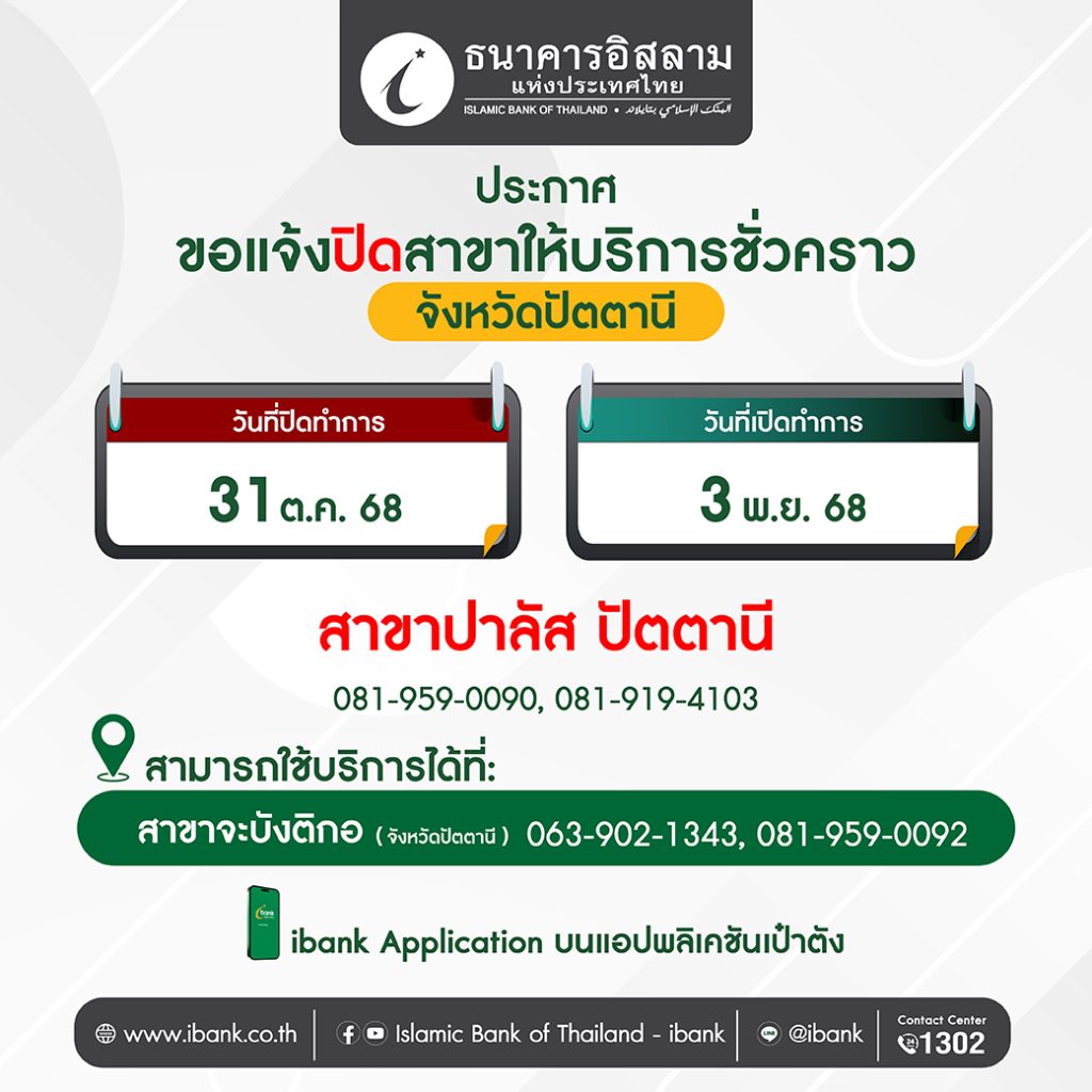 ธนาคารอิสลามแห่งประเทศไทย แจ้งปิดให้บริการสาขาปาลัส จังหวัดปัตตานี ตั้งแต่วันที่ 31 ต.ค. 68 – 2 พ.ย. 68