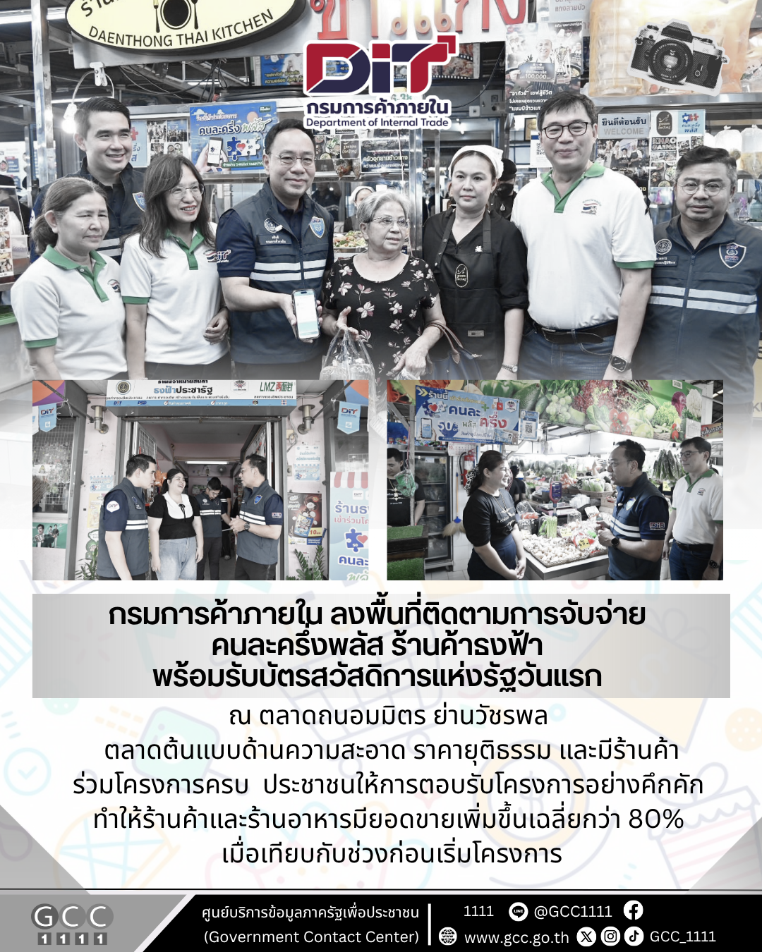 กรมการค้าภายใน ลงพื้นที่ติดตามการจับจ่าย คนละครึ่งพลัส ร้านค้าธงฟ้าพร้อมรับบัตรสวัสดิการแห่งรัฐวันแรก ณ ตลาดถนอมมิตร ย่านวัชรพล ซึ่งเป็นตลาดต้นแบบด้านความสะอาด ราคายุติธรรม และมีร้านค้าร่วมโครงการครบ 100% ประชาชนให้การตอบรับโครงการอย่างคึกคัก ทำให้ร้านค้าและร้านอาหารมียอดขายเพิ่มขึ้นเฉลี่ยกว่า 80% เมื่อเทียบกับช่วงก่อนเริ่มโครงการ