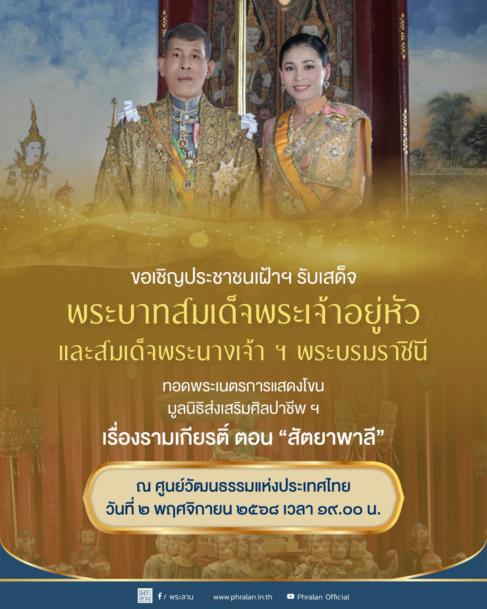 สำนักพระราชวัง ขอเชิญพสกนิกรร่วมเฝ้าทูลละอองธุลีพระบาทรับเสด็จ พระบาทสมเด็จพระเจ้าอยู่หัว และ สมเด็จพระนางเจ้าฯ พระบรมราชินี ในโอกาสเสด็จพระราชดำเนินไปทอดพระเนตรการแสดงโขนมูลนิธิส่งเสริมศิลปาชีพฯ เรื่อง รามเกียรติ์ ตอน “สัตยาพาลี” ในวันอาทิตย์ที่ 2 พฤศจิกายน 2568 เวลา 19.00 น. ณ ศูนย์วัฒนธรรมแห่งประเทศไทย