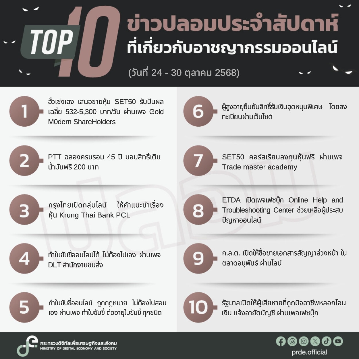 สำหรับอันดับ 1 เรื่อง “ฮั่วเซ่งเฮง เสนอขายหุ้น SET50 รับปันผลเฉลี่ย 532-5,300 บาท/วัน ผ่านเพจ Gold M0dern ShareHolders” กระทรวงดีอี ประสานงานร่วมกับ ตลาดหลักทรัพย์แห่งประเทศไทย (SET) ตรวจสอบพบว่าเป็นข้อมูลเท็จ โดยขอเตือนภัยประชาชน ให้ระวังการหลอกลวงลงทุนออนไลน์ ในช่องทางที่มิจฉาชีพมักใช้เป็นประจำ อย่างในกรณีที่มีการประกาศขายหุ้น SET50 ผ่านโซเชียล ซึ่งทาง SET ยืนยันแล้วว่า ไม่มีการเปิดเพจ Gold M0dern ShareHolders เพื่อขายหุ้นใด ๆ ทั้งสิ้น โดยเพจดังกล่าวแอบอ้างใช้ชื่อ SETโดยไม่ได้รับอนุญาต ทั้งนี้หากมีข้อสงสัยสามารถสอบถามเพิ่มเติมได้ที่ SET Contact Center 0 2009 9999