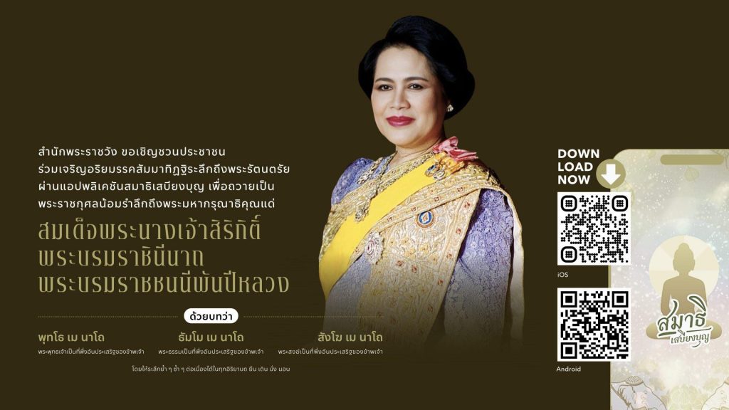 สำนักพระราชวัง ขอเชิญชวนประชาชน ร่วมเจริญอริยมรรคสัมมาทิฏฐิฐิระลึกถึงพระรัตนตรัย ผ่านแอปพลิเคชันสมาธิเสบียงบุญ ด้วยบทว่า พุทโธ เม นาโถ (พระพุทธเจ้าเป็นที่พึ่งอันประเสริฐของข้าพเจ้า) ธัมโม เม นาโถ (พระธรรมเป็นที่พึ่งอันประเสริฐของข้าพเจ้า) สังโฆ เม นาโถ (พระสงฆ์เป็นที่พึ่งอันประเสริฐของข้าพเจ้า) (โดยให้ระลึกย้ำ ๆ ซ้ำ ๆ ต่อเนื่องได้ในทุกอิริยาบถ ยืน เดิน นั่ง นอน) เพื่อถวายเป็นพระราชกุศลน้อมรำลึกถึงพระมหากรุณาธิคุณ สมเด็จพระนางเจ้าสิริกิติ์ พระบรมราชินีนาถ พระบรมราชชนนีพันปีหลวง ทั้งนี้ สามารถดาวน์โหลดแอปพลิเคชันได้ทั้ง PLAY STORE และ APP STORE