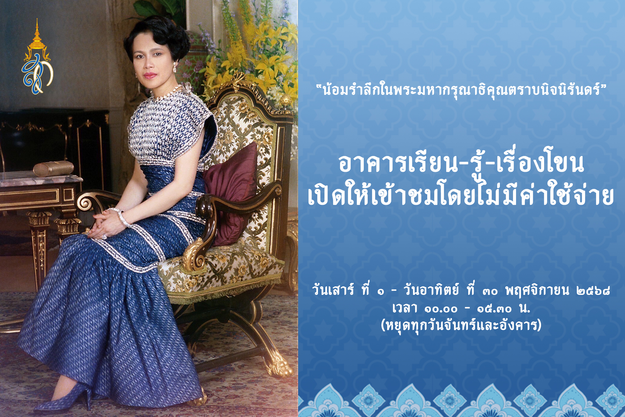 อาคารเรียน-รู้-เรื่องโขน เปิดให้เข้าชมโดยไม่มีค่าใช้จ่าย เพื่อ “น้อมรำลึกในพระมหากรุณาธิคุณตราบนิจนิรันดร์” ระหว่างวันเสาร์ ที่ 1 – วันอาทิตย์ ที่ 30 พฤศจิกายน 2568 เวลา 10.00 – 15.30 น. (หยุดทุกวันจันทร์และอังคาร)