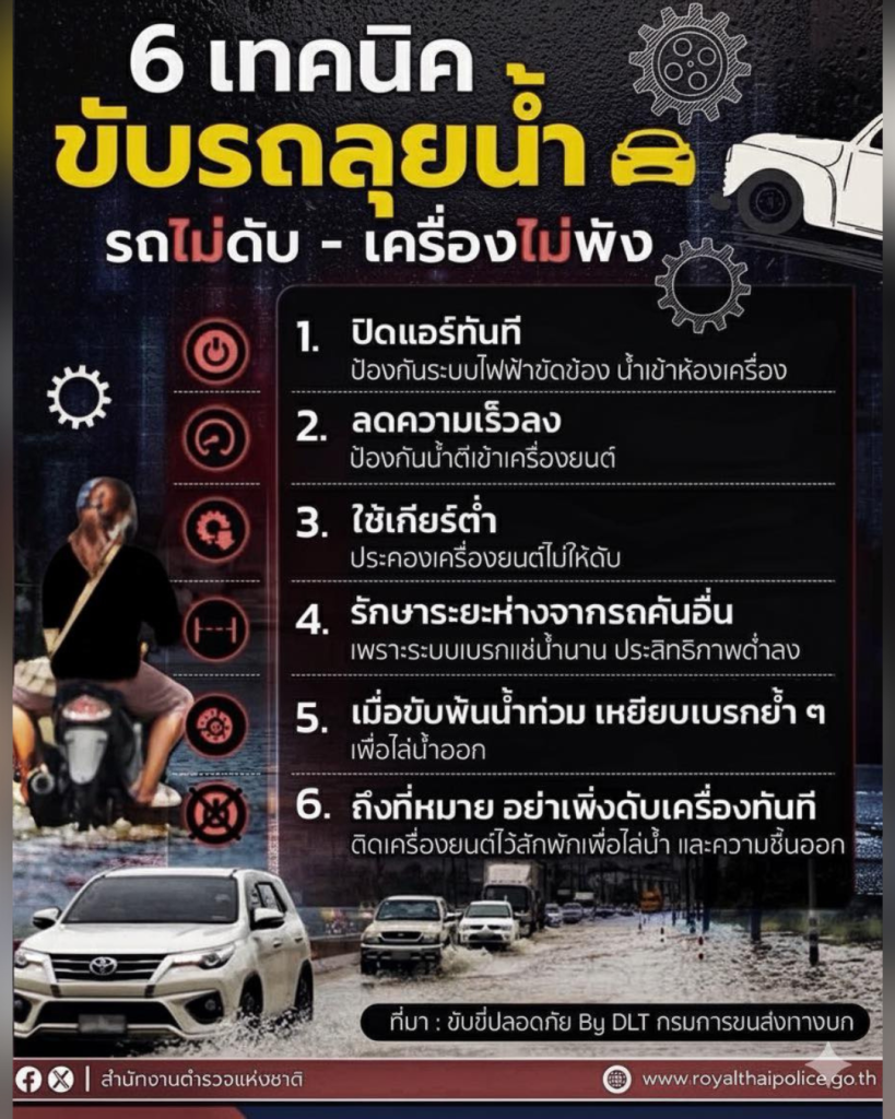 สำนักงานตำรวจแห่งชาติ แนะนำ 6 เทคนิคขับรถลุยน้ำ แบบรถไม่ดับ เครื่องไม่พัง ถึงที่หมายปลอดภัย