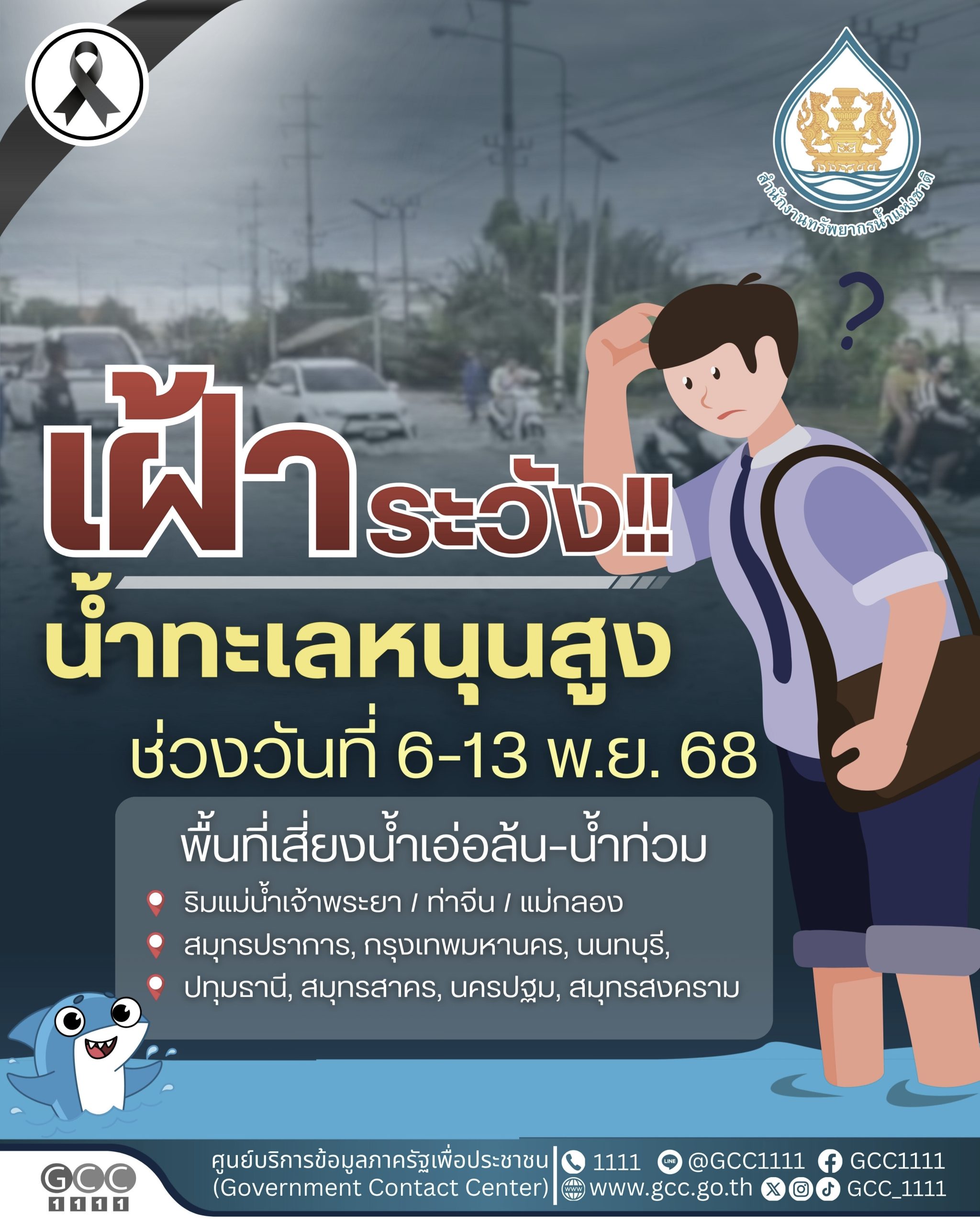 สทนช. ติดตามสถานการณ์ระดับน้ำจากกรมอุทกศาสตร์ พบว่าในช่วงวันที่ 6-13 พ.ย. 68 ระหว่างเวลา ประมาณ 06.00 – 13.00 น. จะเป็นช่วงที่อาจเกิด น้ำทะเลหนุนสูง ในพื้นที่ลุ่มต่ำริมแม่น้ำเจ้าพระยา และพื้นที่แม่น้ำใกล้เคียง