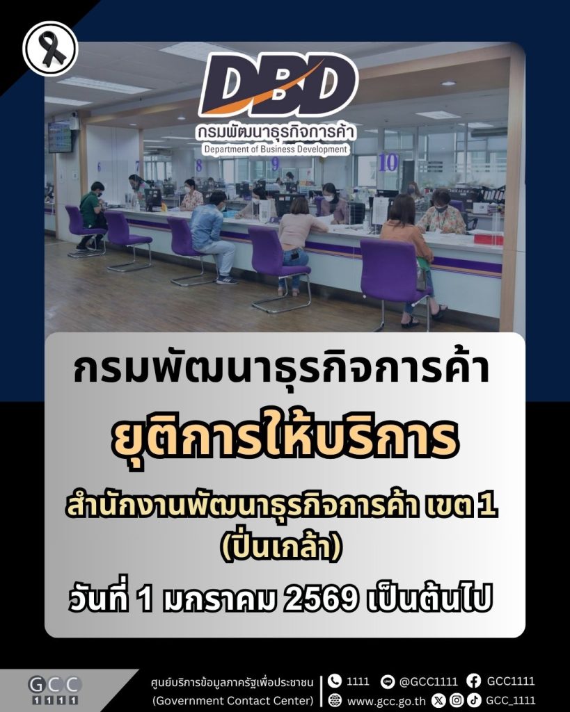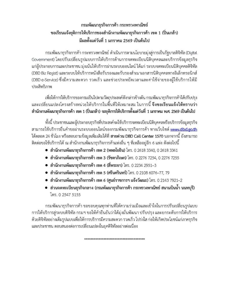 กรมพัฒนาธุรกิจการค้า แจ้งยุติการให้บริการของสํานักงานพัฒนาธุรกิจการค้า เขต 1 (ปิ่นเกล้า) ตั้งแต่วันที่ 1 มกราคม 2569 เป็นต้นไป ประชาชนและผู้ประกอบธุรกิจที่จะใช้บริการจดทะเบียนนิติบุคคลหรือบริการข้อมูลธุรกิจ สามารถใช้บริการยื่นคําขอ ผ่านระบบออนไลน์กรมพัฒนาธุรกิจการค้า เว็บไซต์ www.dbd.go.th ได้ตลอด 24 ชั่วโมง รวมถึงสามารถติดต่อขอใช้บริการได้ ณ สํานักงานพัฒนาธุรกิจการค้าแห่งอื่น ๆ ที่เหลืออยู่อีก 6 แห่ง