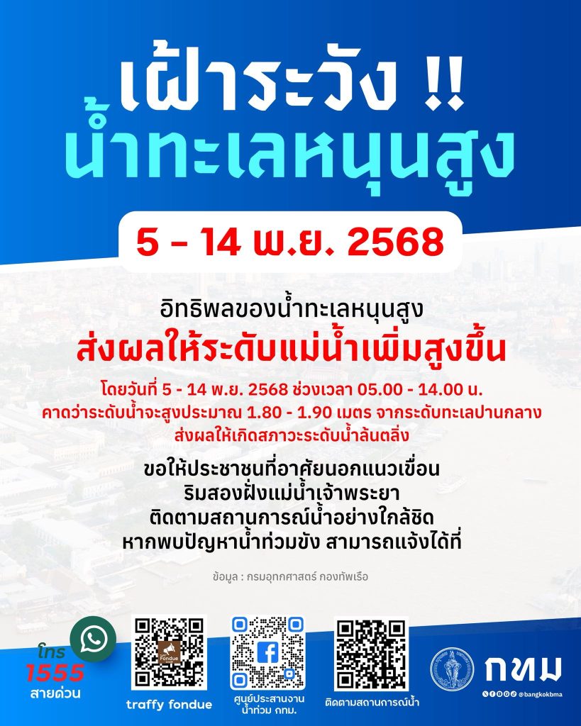 กรุงเทพมหานคร เฝ้าระวังน้ำทะเลหนุนสูง วันที่ 5 – 14 พฤศจิกายน 2568 โดยวันที่ วันที่ 5 – 14 พฤศจิกายน 2568 ช่วงเวลา 05.00 – 14.00 น. คาดว่าระดับน้ำจะสูงประมาณ 1.80 – 1.90 เมตร จากระดับน้ำทะเลปานกลาง ส่งผลให้เกิดสภาวะระดับน้ำล้นตลิ่ง ทั้งนี้ ขอให้ประชาชนที่อาศัยนอกแนวเขื่อนริมสองฝั่งแม่น้ำเจ้าพระยาติดตามสถานการณ์น้ำอย่างใกล้ชิด