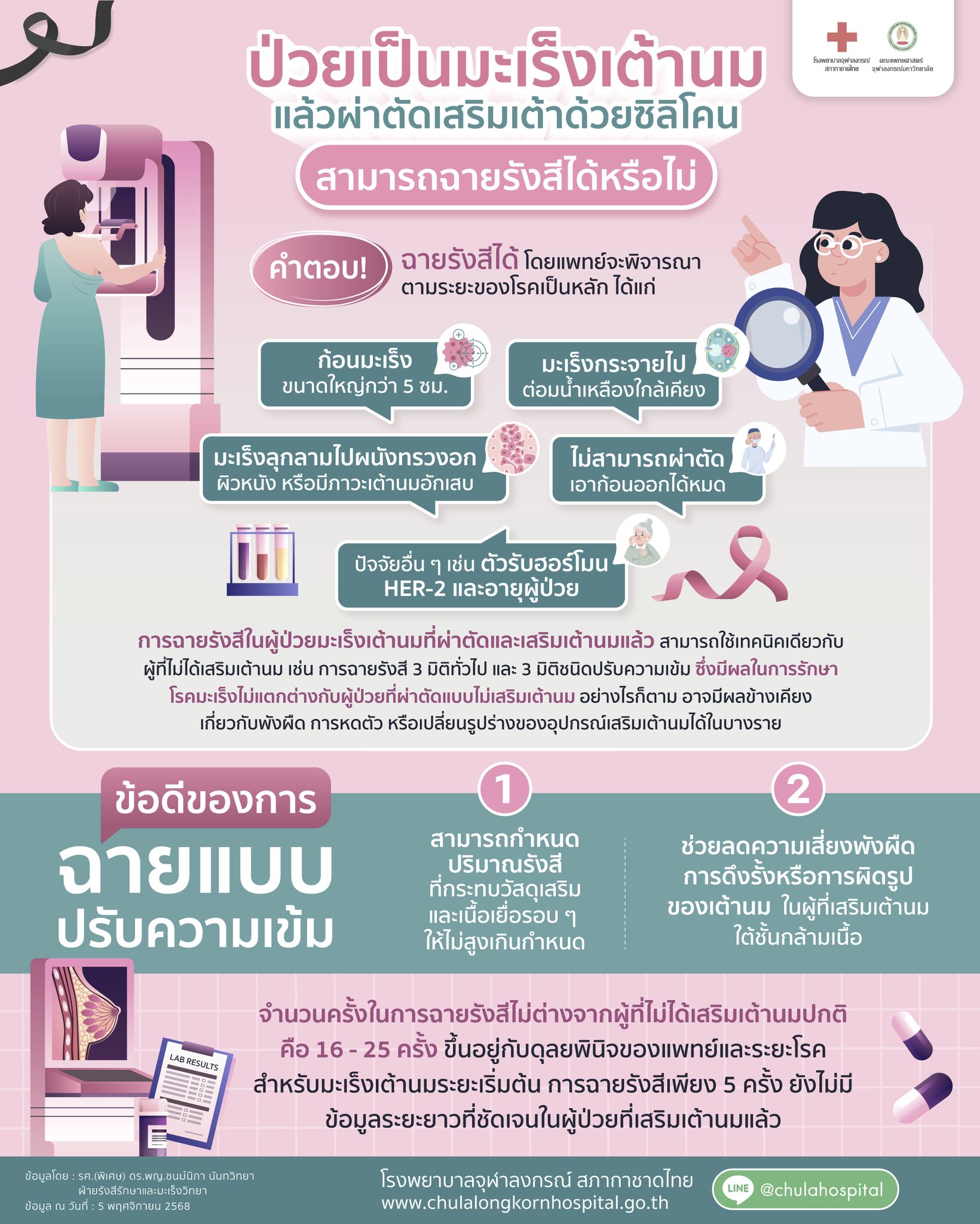 โรงพยาบาลจุฬาลงกรณ์ สภากาชาดไทย แนะนำป่วยเป็นมะเร็งเต้านมแล้วผ่าตัดเสริมเต้าด้วยซิลิโคน สามารถฉายรังสีได้หรือไม่