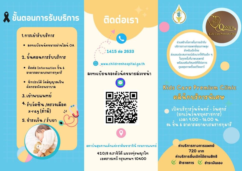 นายแพทย์อาคม ชัยวีระวัฒนะ ผู้อำนวยการสถาบันสุขภาพเด็กแห่งชาติมหาราชินี กรมการแพทย์ กล่าวเพิ่มเติม Premium Clinic ได้รับการออกแบบให้มีบรรยากาศที่เป็นมิตรกับเด็กและครอบครัว ได้รับบริการที่รวดเร็ว และไม่ต้องรอนาน มีเครื่องมือการตรวจรักษาที่ทันสมัย ลดความวิตกกังวล และความกลัวของเด็กและผู้ปกครอง โดยจะมีระบบการนัดหมายล่วงหน้า ที่ช่วยลดความแออัดและเวลารอคอย ได้อย่างมีประสิทธิภาพ ผู้ปกครองสามารถวางแผนการเดินทางมาใช้บริการได้อย่างสะดวกสบาย โดยไม่ต้องกังวลเรื่องการรอคิวนาน Premium Clinic สำหรับเด็กของเรามุ่งเน้นการให้บริการที่หลากหลาย ตั้งแต่ทารกแรกเกิดจนถึงวัยรุ่น พร้อมรับปรึกษาปัญหาด้านพฤติกรรมและพัฒนาการที่อาจส่งผลต่อการเรียนรู้และการปรับตัวของเด็ก บริการของเรายังครอบคลุมการดูแลโรคที่พบบ่อยในเด็ก เช่น ไข้หวัด โรคภูมิแพ้ โรคทางเดินหายใจ รวมถึงการดูแลด้านการเจริญเติบโต และติดตามส่วนสูงน้ำหนักให้เหมาะสมตามวัย การให้คำปรึกษาด้านโภชนาการที่เหมาะสมกับเด็กแต่ละช่วงวัย การฉีดวัคซีนครบตามตารางและวัคซีนเสริมพิเศษ รวมถึงการให้คำแนะนำด้านการเลี้ยงดูเด็กยุคใหม่ โดยมีทีมกุมารแพทย์เฉพาะทางพร้อมดูแล
