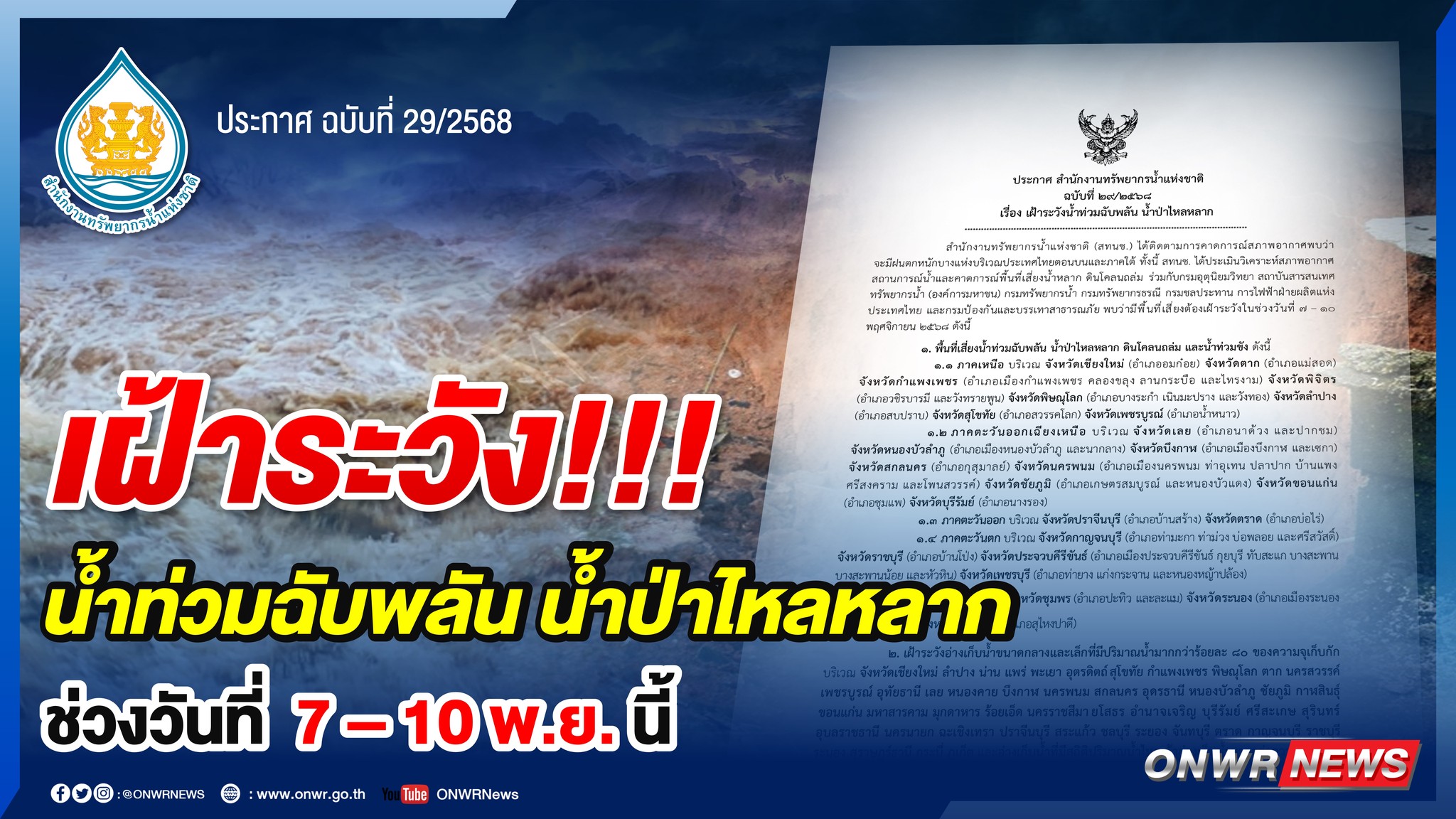 สำนักงานทรัพยากรน้ำแห่งชาติ เตือนเฝ้าระวังน้ำท่วมฉับพลัน น้ำป่าไหลหลาก ในช่วงวันที่ 7 – 10 พฤศจิกายน 2568