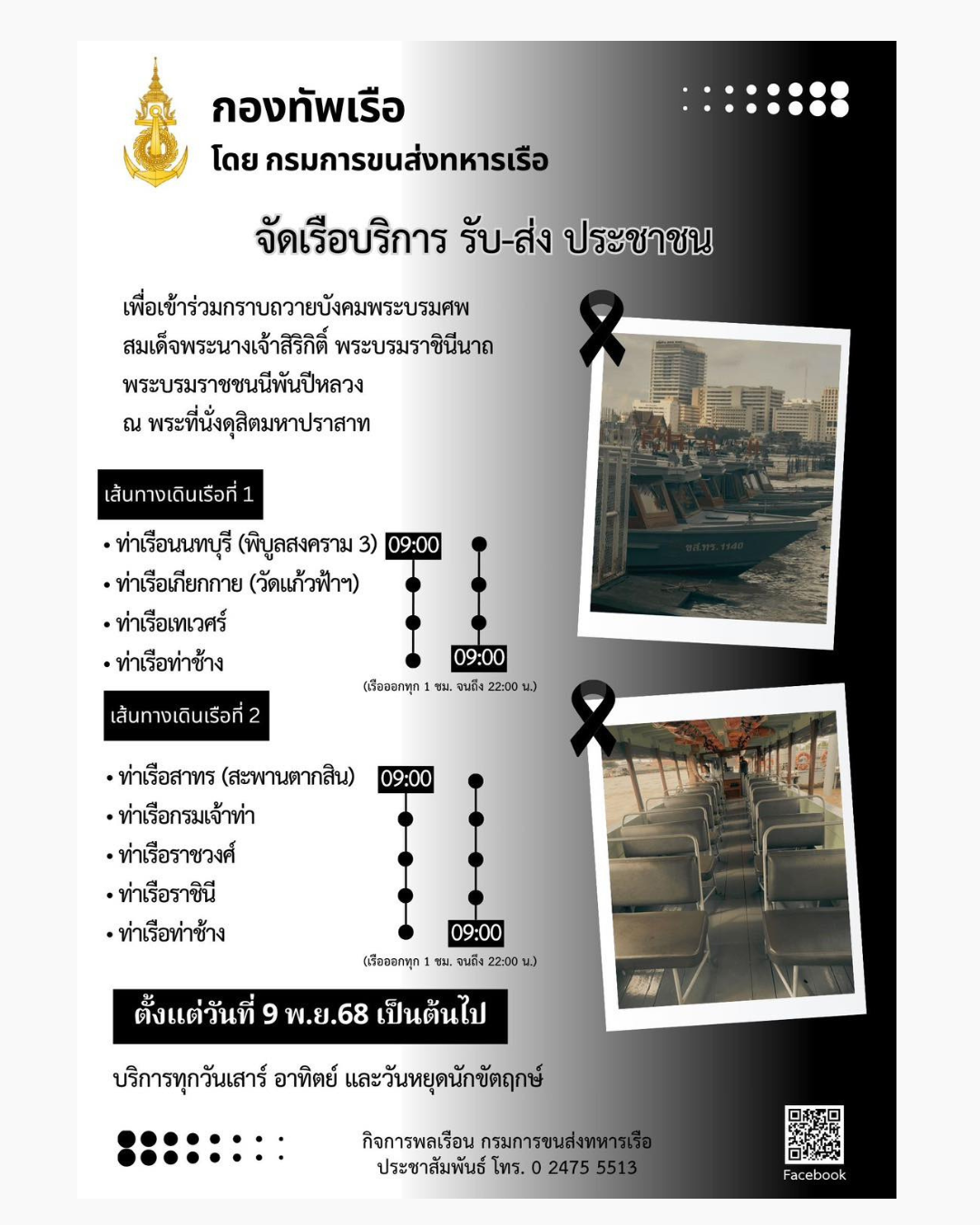 กองทัพเรือ จัดเรือบริการรับ – ส่ง ประชาชน ร่วมกราบถวายบังคมพระบรมศพสมเด็จพระบรมราชชนนีพันปีหลวง ข่าวสารกิจกรรม, สมเด็จพระบรมราชชนนีพันปีหลวง กองทัพเรือ จัดเรือบริการรับ – ส่ง ประชาชน ร่วมกราบถวายบังคมพระบรมศพสมเด็จพระบรมราชชนนีพันปีหลวง กองทัพเรือ โดยกรมการขนส่งทหารเรือ จัดเรือบริการรับ – ส่ง ประชาชน เพื่อเข้าร่วมกราบถวายบังคมพระบรมศพ สมเด็จพระนางเจ้าสิริกิติ์ พระบรมราชินีนาถ พระบรมราชชนนีพันปีหลวง ณ พระที่นั่งดุสิตมหาปราสาท ในวันเสาร์ อาทิตย์ และวันหยุดนักขัตฤกษ์ ตั้งแต่วันที่ 9 พฤศจิกายน 2568 เป็นต้นไป เส้นทางเดินเรือที่ 1ท่าเรือนนทบุรี (พิบูลสงคราม 3)ท่าเรือเกียกกาย (วัดแก้วฟ้าฯ)ท่าเรือเทเวศร์ท่าเรือท่าช้างเส้นทางเดินเรือที่ 2ท่าเรือสาทร (สะพานตากสิน)ท่าเรือกรมเจ้าท่าท่าเรือราชวงศ์ท่าเรือราชินีท่าเรือท่าช้างหมายเหตุ : เรือออกทุก 1 ชั่วโมง จนถึงเวลา 22.00 น.สอบถามเพิ่มเติมที่ กิจการพลเรือน กรมการขนส่งทหารเรือประชาสัมพันธ์ โทร. 0 2475 5513 ที่มา : Facebook กองทัพเรือ Royal Thai Navy Post Views: 25 FacebookFacebookXTwitterLINELine