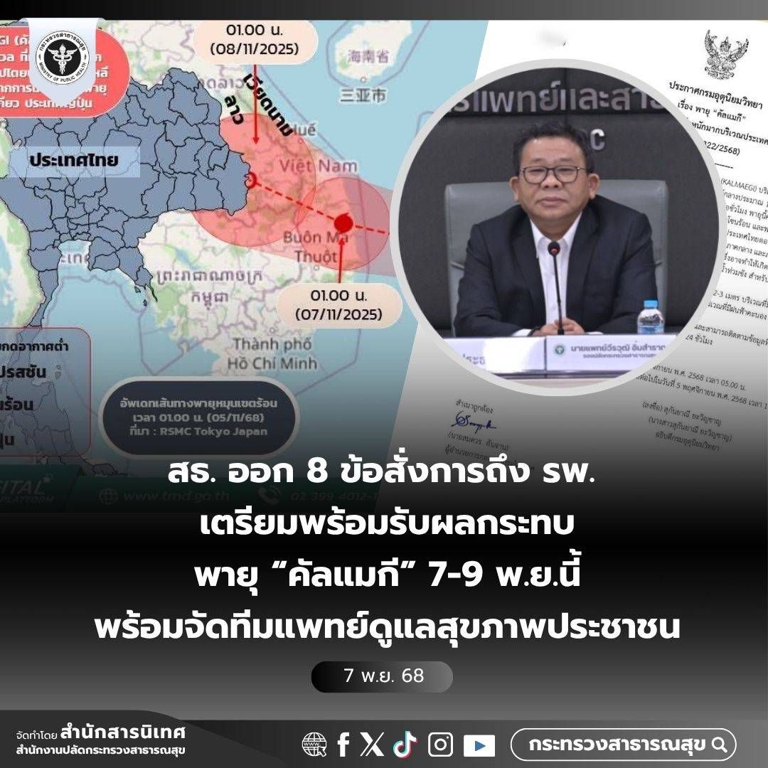 สธ. ออก 8 ข้อสั่งการถึง รพ. เตรียมพร้อมรับผลกระทบพายุ “คัลแมกี” วันที่ 7 – 9 พ.ย. 68