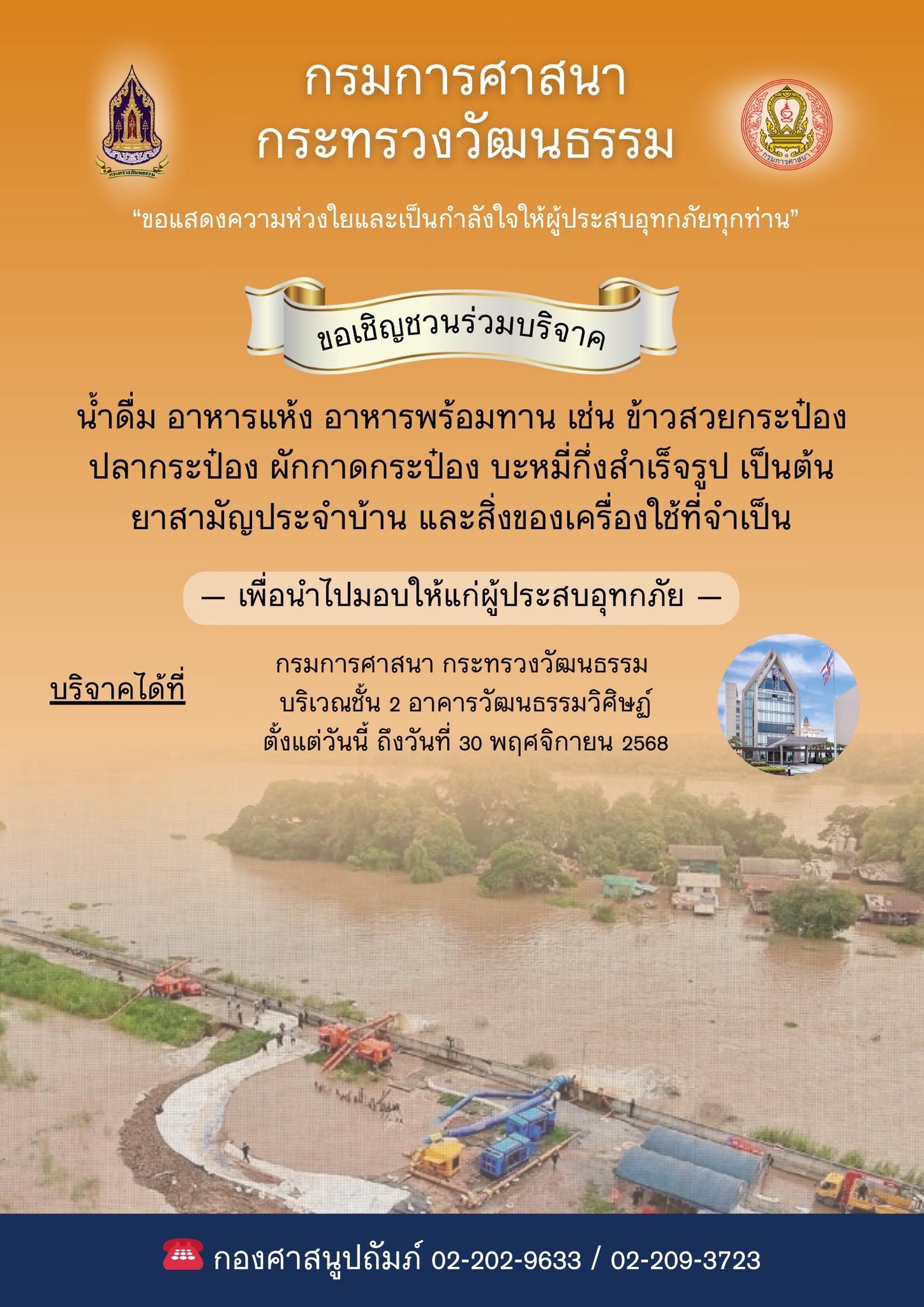 กรมการศาสนา เปิดรับบริจาคสิ่งของอุปโภคบริโภค ช่วยเหลือผู้ประสบภัยทั่วประเทศ ถึง 30 พ.ย. 68 ข่าวสารกิจกรรม, สาธารณภัย กรมการศาสนา เปิดรับบริจาคสิ่งของอุปโภคบริโภค ช่วยเหลือผู้ประสบภัยทั่วประเทศ ถึง 30 พ.ย. 68 กรมการศาสนา เปิดรับบริจาคสิ่งของอุปโภคบริโภค ช่วยเหลือผู้ประสบภัยทั่วประเทศ สามารถบริจาคได้ที่ ชั้น 2 อาคารวัฒนธรรมวิศิษฏ์ กรมการศาสนา กระทรวงวัฒนธรรม ตั้งแต่บัดนี้ – 30 พฤศจิกายน 2568 กรมการศาสนา ขอเชิญร่วมส่งต่อ “น้ำใจ” เพื่อช่วยเหลือผู้ประสบภัยสามารถบริจาค น้ำดื่ม อาหารแห้ง อาหารพร้อมทาน ยาสามัญประจำบ้าน และของใช้จำเป็น เพื่อร่วมบรรเทาความเดือดร้อนในยามยาก เพื่อนำไปมอบให้แก่ผู้ประสบภัย สามารถบริจาคได้ที่ ชั้น 2 อาคารวัฒนธรรมวิศิษฏ์ กรมการศาสนา กระทรวงวัฒนธรรม ตั้งแต่บัดนี้ – 30 พฤศจิกายน 2568 สอบถามข้อมูลเพิ่มเติมได้ที่ กองศาสนูปถัมภ์ โทร. 0 2202 9633 / 0 2209 3723 ที่มา : Facebook กรมการศาสนา Post Views: 25 FacebookFacebookXTwitterLINELine
