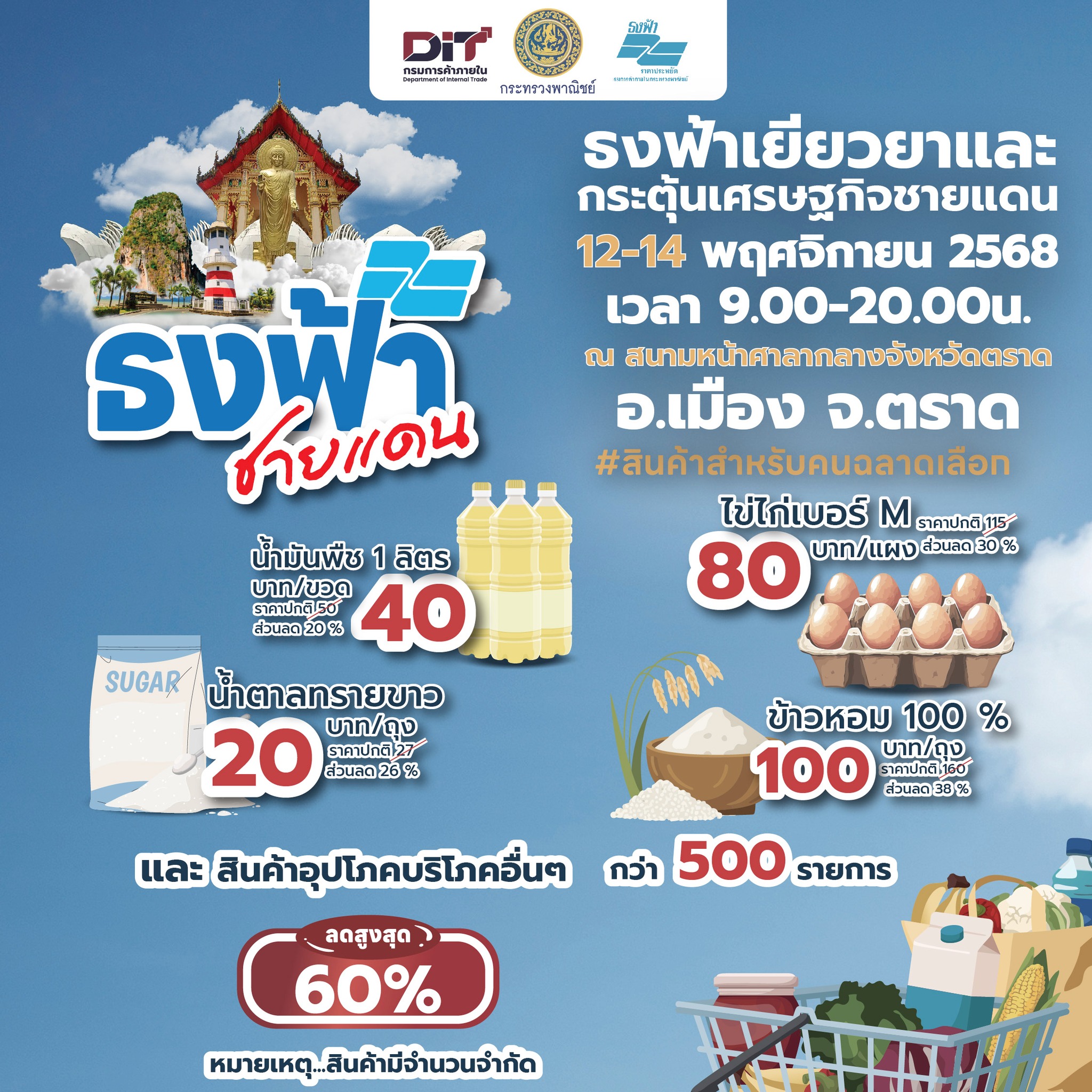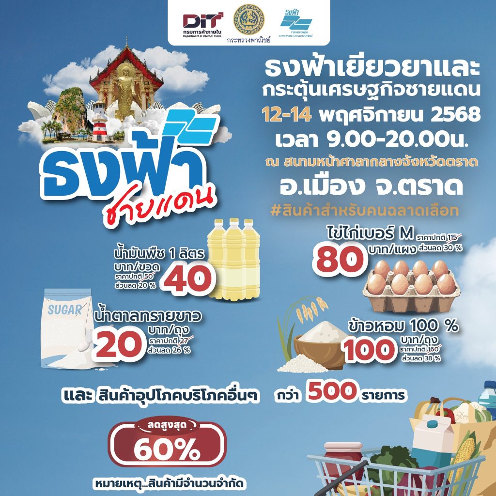 กรมการค้าภายใน จัดงานธงฟ้าเยียวยาและกระตุ้นเศรษฐกิจชายแดน จังหวัดตราด วันที่ 12 – 14 พฤศจิกายน 2568 เวลา 09.00 – 20.00 น. ณ สนามหน้าศาลากลางจังหวัดตราด อ.เมือง จ.ตราด ภายในงานยกขบวน สินค้าราคาประหยัดกว่า 500 รายการ ลดสูงสุดถึง 60%