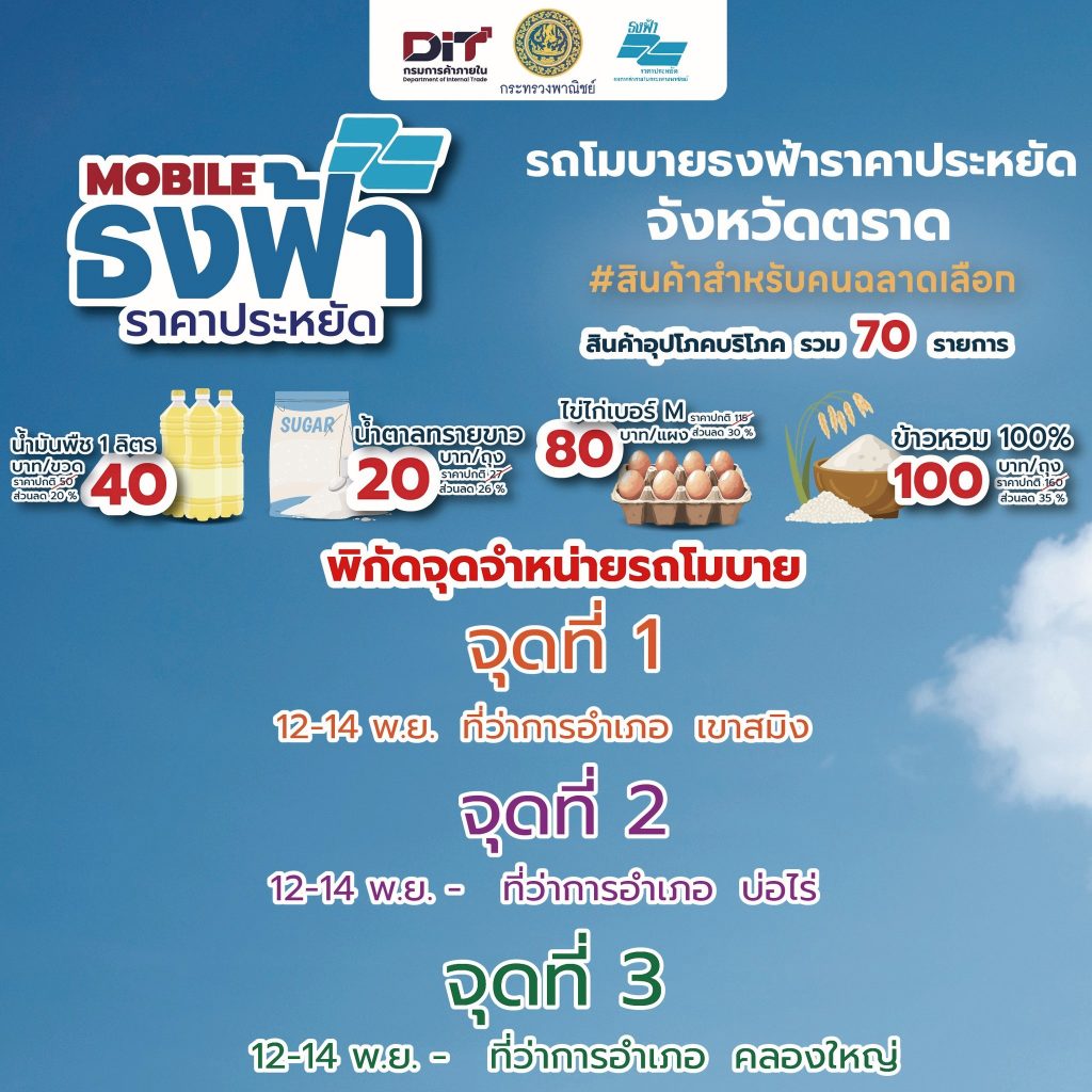 • Mobile ธงฟ้าราคาประหยัด จ.ตราด พบกับรถโมบายธงฟ้า บุกพื้นที่ 3 อำเภอ นำสินค้าราคาประหยัดรวมกว่า 70 รายการ ไปถึงชุมชน
