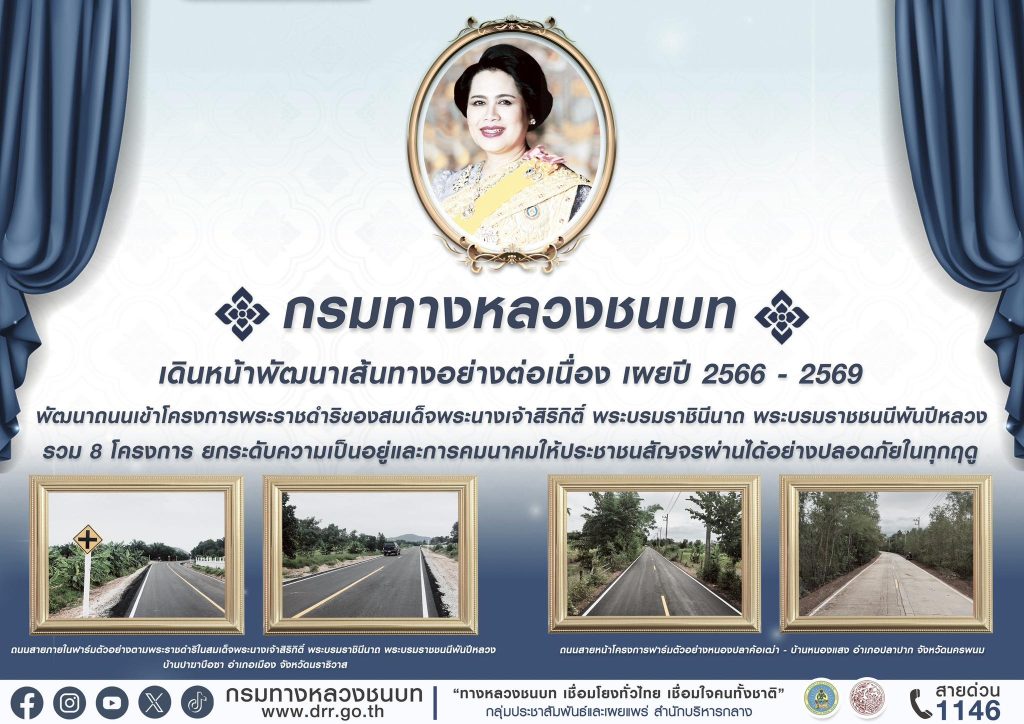กรมทางหลวงชนบท พัฒนาถนนเข้าโครงการพระราชดำริของสมเด็จพระนางเจ้าสิริกิติ์ พระบรมราชินีนาถ พระบรมราชชนนีพันปีหลวง เพื่อยกระดับคุณภาพชีวิตของประชาชนทั่วทุกพื้นที่ให้สามารถคมนาคมขนส่งได้อย่างสะดวกปลอดภัยได้ในทุกฤดู ให้สามารถขนย้ายผลิตผลทางการเกษตรในพื้นที่ชุมชนออกสู่ตลาด ควบคู่กับการส่งเสริมการท่องเที่ยววิถีชุมชน