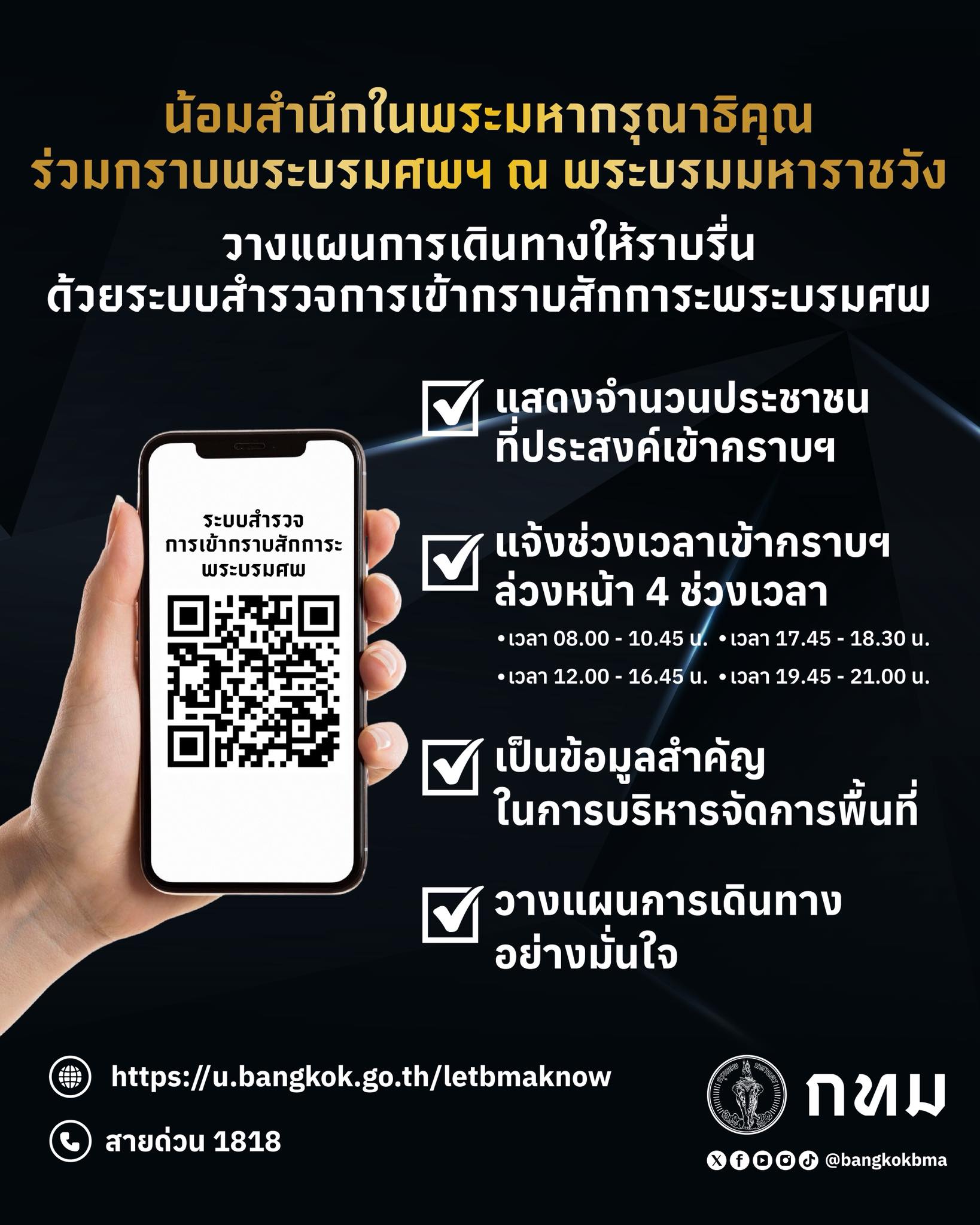 กรุงเทพมหานคร แนะนำประชาชน ใช้ระบบออนไลน์ ในการเข้ากราบสักการะพระบรมศพฯ ข่าวสารกิจกรรม, สมเด็จพระบรมราชชนนีพันปีหลวง กรุงเทพมหานคร แนะนำประชาชน ใช้ระบบออนไลน์ ในการเข้ากราบสักการะพระบรมศพฯ กรุงเทพมหานคร ขอเชิญประชาชนวางแผนการเดินทางล่วงหน้า การเข้ากราบสักการะพระบรมศพฯ โดยใช้ระบบออนไลน์แสดงความประสงค์เข้ากราบฯ และเลือกช่วงเวลาที่สะดวก เพื่อความเรียบร้อยและสะดวกในการจัดการพื้นที่ กรุงเทพมหานคร ขอเชิญประชาชนวางแผนการเดินทางล่วงหน้า การเข้ากราบสักการะพระบรมศพฯ โดยใช้ระบบสำรวจการเข้ากราบสักการะพระบรมศพฯ ผ่านการสแกน QR Code หรือเข้าสู่เว็บไซต์ https://sites.google.com/view/letbmaknow เพื่อแสดงความประสงค์เข้ากราบฯ และเลือกช่วงเวลาที่สะดวก ทั้งนี้ เพื่อความเรียบร้อยและสะดวกในการจัดการพื้นที่ หากต้องการสอบถามข้อมูลเพิ่มเติมเกี่ยวกับการเข้ากราบถวายบังคมพระบรมศพฯ ติดต่อได้ที่ สายด่วน โทร. 1818 ที่มา : Facebook กรุงเทพมหานคร Post Views: 50 FacebookFacebookXTwitterLINELine