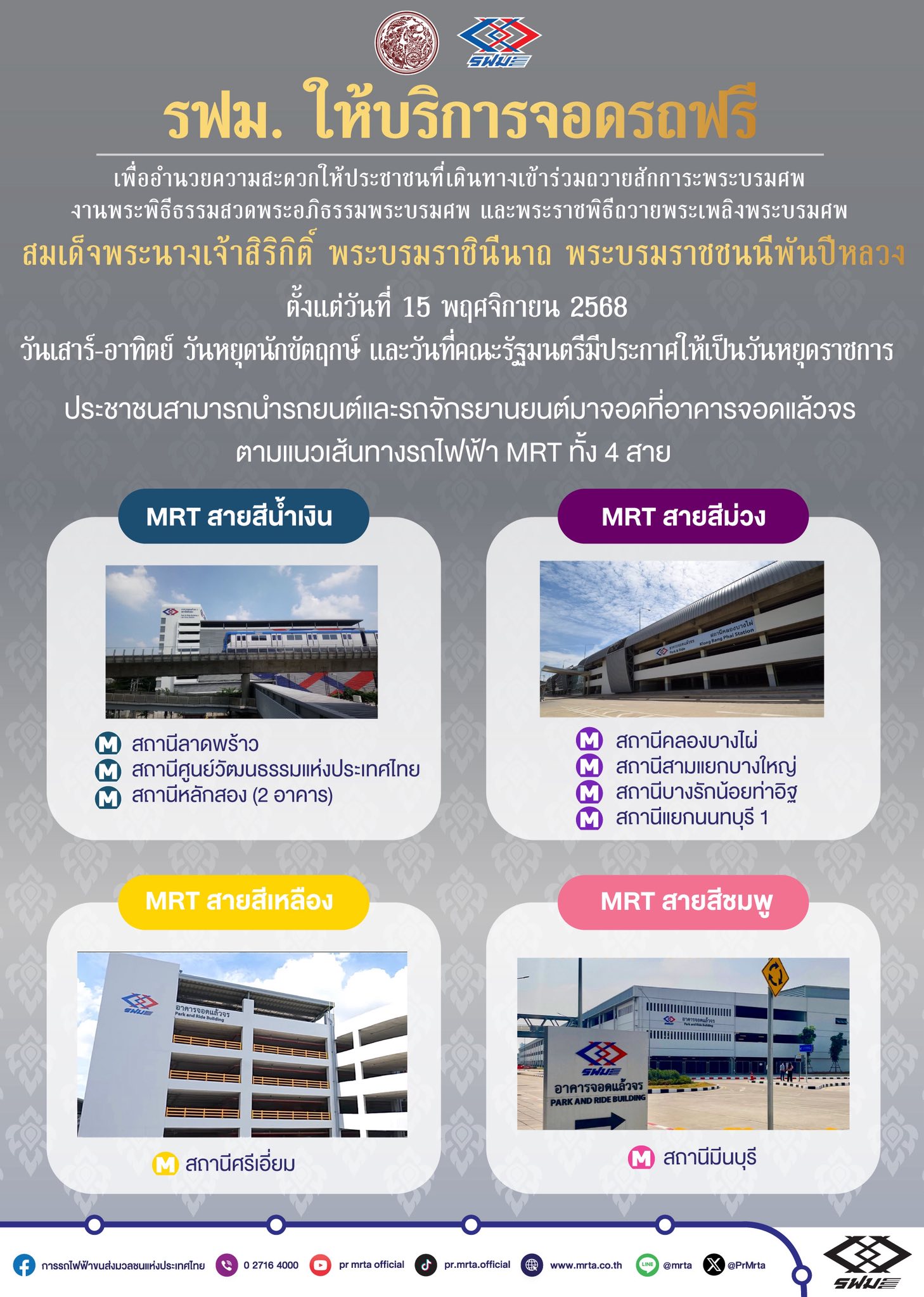 รถไฟฟ้ามหานคร สายสีน้ำเงิน เปิดอาคารจอดแล้วจร 3 แห่ง ฟรี สถานีลาดพร้าว สถานีศูนย์วัฒนธรรมแห่งประเทศไทย และสถานีหลักสอง (2 อาคาร) เฉพาะวันเสาร์ วันอาทิตย์ วันหยุดนักขัตฤกษ์ และวันที่คณะรัฐมนตรีมีประกาศให้เป็นวันหยุดราชการ ตั้งแต่วันที่ 15 พฤศจิกายน 2568 เป็นต้นไป ตลอดช่วงการจัดงานพระพิธีธรรมสวดพระอภิธรรมพระบรมศพ และพระราชพิธีถวายพระเพลิงพระบรมศพสมเด็จพระนางเจ้าสิริกิติ์ พระบรมราชินีนาถ พระบรมราชชนนีพันปีหลวง