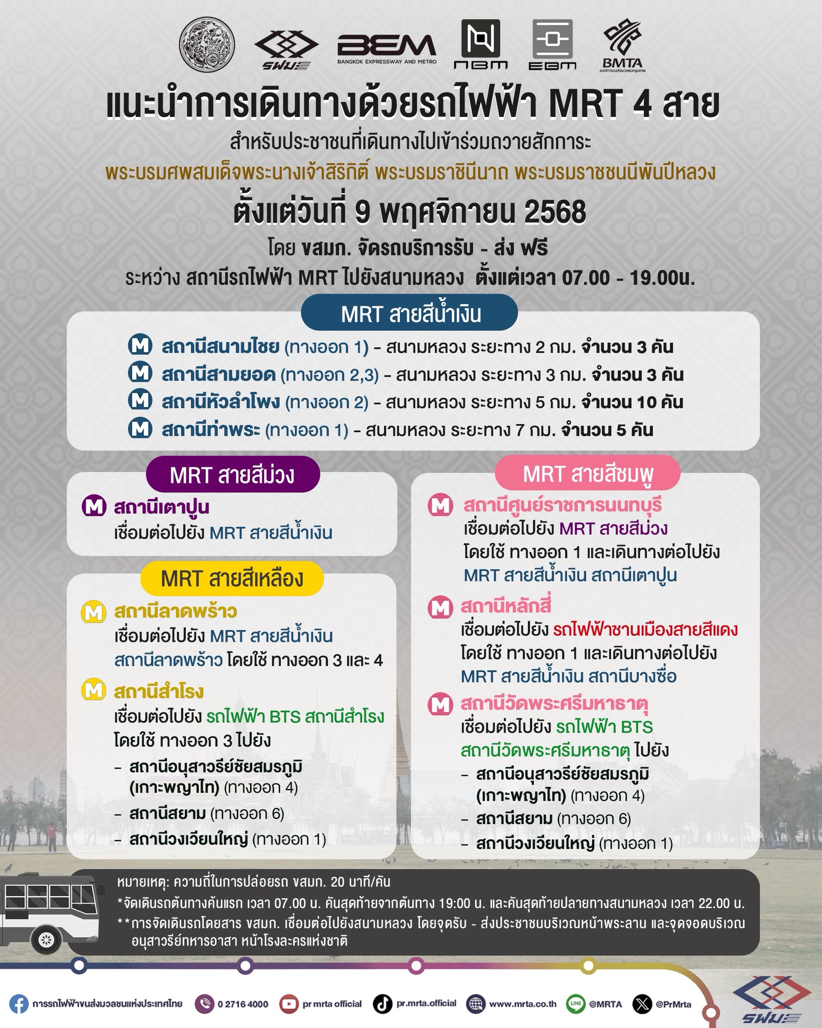 ทั้งนี้ องค์การขนส่งมวลชนกรุงเทพ (ขสมก.) ได้จัดรถบริการรับ – ส่ง ฟรี ระหว่างสถานีรถไฟฟ้า MRT สายสีน้ำเงิน ไปยังสนามหลวง ตั้งแต่เวลา 07.00 – 19.00 น. ดังนี้