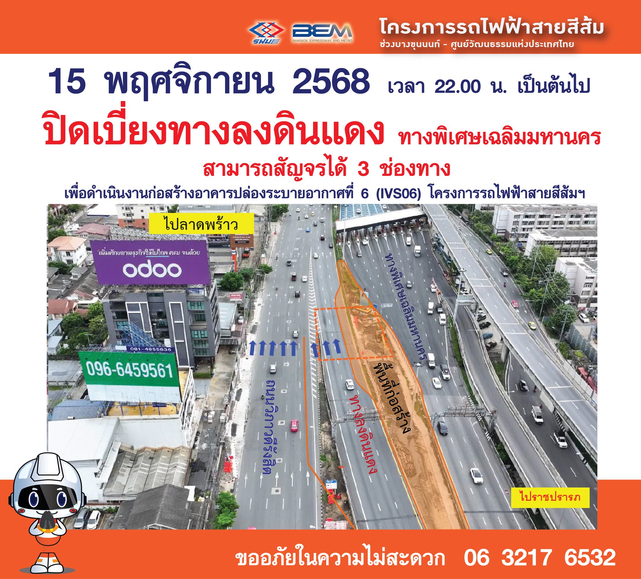 รฟม. แจ้งปิดเบี่ยงทางลงดินแดงทางพิเศษเฉลิมมหานคร วันที่ 15 พ.ย.68 เป็นต้นไป ข่าวสารกิจกรรม รฟม. แจ้งปิดเบี่ยงทางลงดินแดงทางพิเศษเฉลิมมหานคร วันที่ 15 พ.ย.68 เป็นต้นไป การรถไฟฟ้าขนส่งมวลชนแห่งประเทศไทย แจ้งปิดเบี่ยงทางลงดินแดงทางพิเศษเฉลิมมหานคร วันที่ 15 พฤศจิกายน 2568 เวลา 22.00 น. เป็นต้นไป เพื่อดำเนินงานก่อสร้างอาคารปล่องระบายอากาศที่ 6 (IVS06) โครงการรถไฟฟ้าสายสีส้ม ประชาสัมพันธ์ โครงการรถไฟฟ้าสายสีส้ม ช่วงบางขุนนนท์ – ศูนย์วัฒนธรรมแห่งประเทศไทย แจ้งปิดเบี่ยงทางลงดินแดงทางพิเศษเฉลิมมหานคร ตั้งแต่วันที่ 15 พฤศจิกายน 2568 เวลา 22.00 น. เป็นต้นไป #เพื่อดำเนินงานก่อสร้างอาคารปล่องระบายอากาศที่ 6 (IVS06) โครงการรถไฟฟ้าสายสีส้ม มีผลให้บริเวณทางลงทางด่วนดินแดง สามารถสัญจรได้ 3 ช่องจราจร ทั้งนี้ การปิดเบี่ยงจราจรเพื่อดำเนินงานดังกล่าว อาจทำให้ผู้ใช้เส้นทางไม่ได้รับความสะดวกในการเดินทาง ต้องขออภัยมา ณ โอกาสนี้ โดยผู้ใช้เส้นทางสามารถสอบถามรายละเอียดการเบี่ยงจราจรได้ที่หมายเลข 06 3217 6532 และติดตามข้อมูลโครงการฯ ได้ที่ Facebook โครงการรถไฟฟ้าสายสีส้ม ช่วงบางขุนนนท์ – ศูนย์วัฒนธรรมแห่งประเทศไทย ที่มา : Facebook โครงการรถไฟฟ้าสายสีส้มช่วงบางขุนนนท์ – ศูนย์วัฒนธรรมแห่งประเทศไทย Post Views: 45 FacebookFacebookXTwitterLINELine
