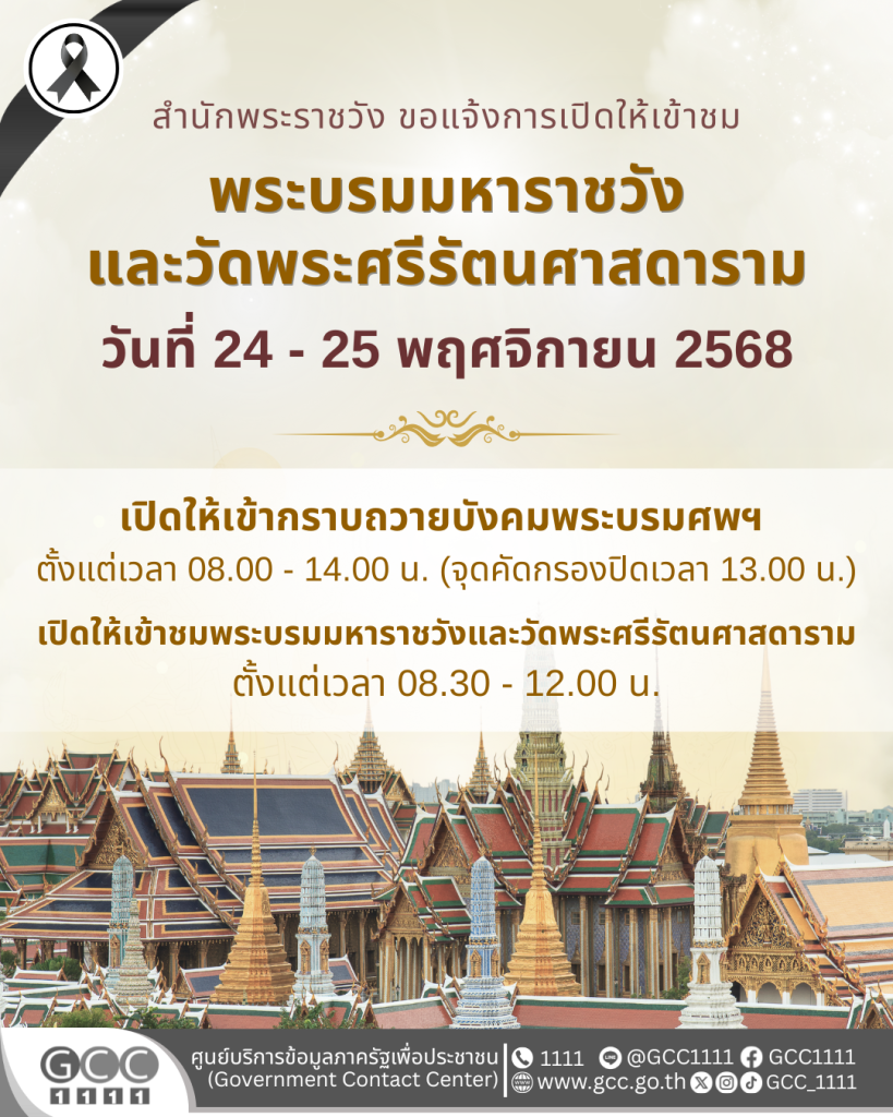 สำนักพระราชวัง ขอแจ้งการเปิดให้เข้าชมพระบรมมหาราชวังและวัดพระศรีรัตนศาสดาราม ระหว่างวันที่ 24 – 25 พฤศจิกายน 2568 เนื่องจากมีพระราชพิธีทรงบำเพ็ญพระราชกุศล