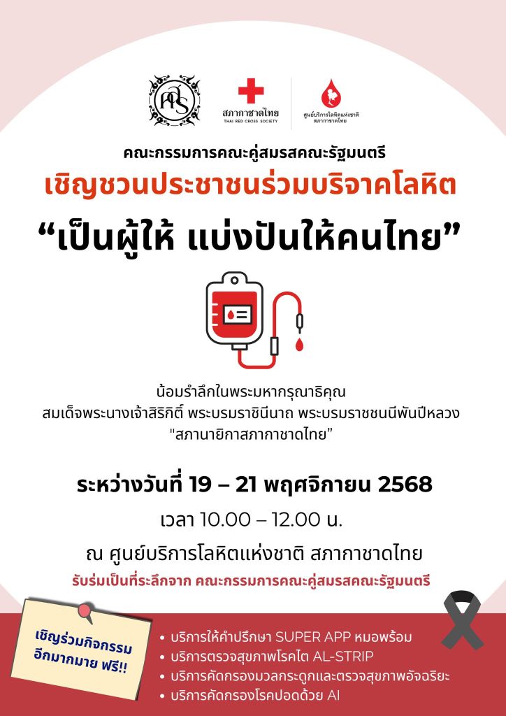 สภากาชาดไทย ขอเชิญร่วมบริจาคโลหิต ในกิจกรรม “เป็นผู้ให้ แบ่งปันให้คนไทย” วันที่ 19 – 21 พ.ย. 68