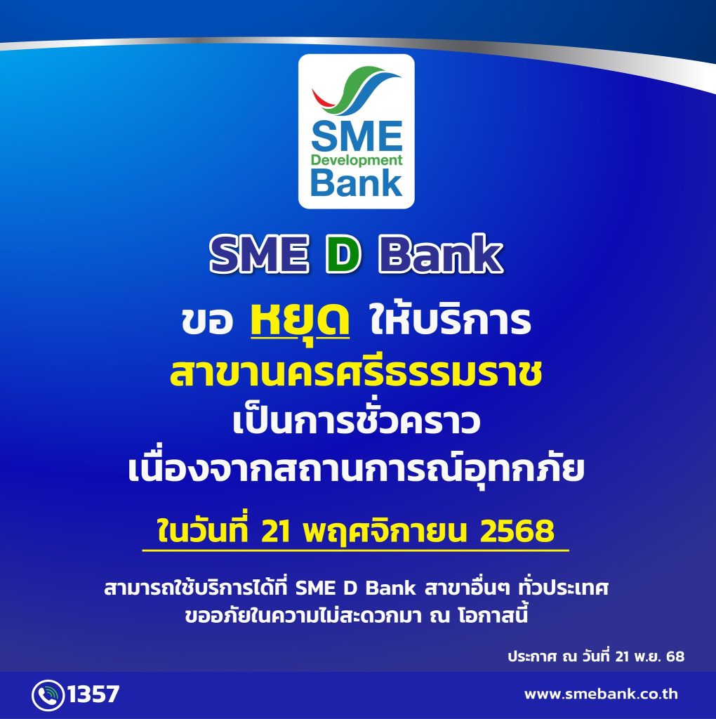 SME D Bank ขอแจ้งหยุดให้บริการ “สาขานครศรีธรรมราช” เป็นการชั่วคราว เนื่องจากสถานการณ์อุทกภัยในพื้นที่ ข่าวสารกิจกรรม, สาธารณภัย SME D Bank ขอแจ้งหยุดให้บริการ “สาขานครศรีธรรมราช” เป็นการชั่วคราว เนื่องจากสถานการณ์อุทกภัยในพื้นที่ ธนาคารพัฒนาวิสาหกิจขนาดกลางและขนาดย่อมแห่งประเทศไทย ขอแจ้งหยุดให้บริการ สาขานนครศรีธรรมราช เป็นการชั่วคราว ในวันที่ 21 พฤศจิกายน 2568 เนื่องจากเกิดสถานการณ์อุทกภัยในพื้นที่ทั้งนี้ สามารถใช้บริการได้ที่ SME D Bank สาขาใกล้เคียง และทุกสาขาทั่วประเทศสอบถามข้อมูลเพิ่มเติม Call Center 1357ขออภัยในความไม่สะดวกมา ณ โอกาสนี้ ที่มา : Facebook ธนาคารพัฒนาวิสาหกิจขนาดกลางและขนาดย่อมแห่งประเทศไทย Post Views: 12 FacebookFacebookXTwitterLINELine