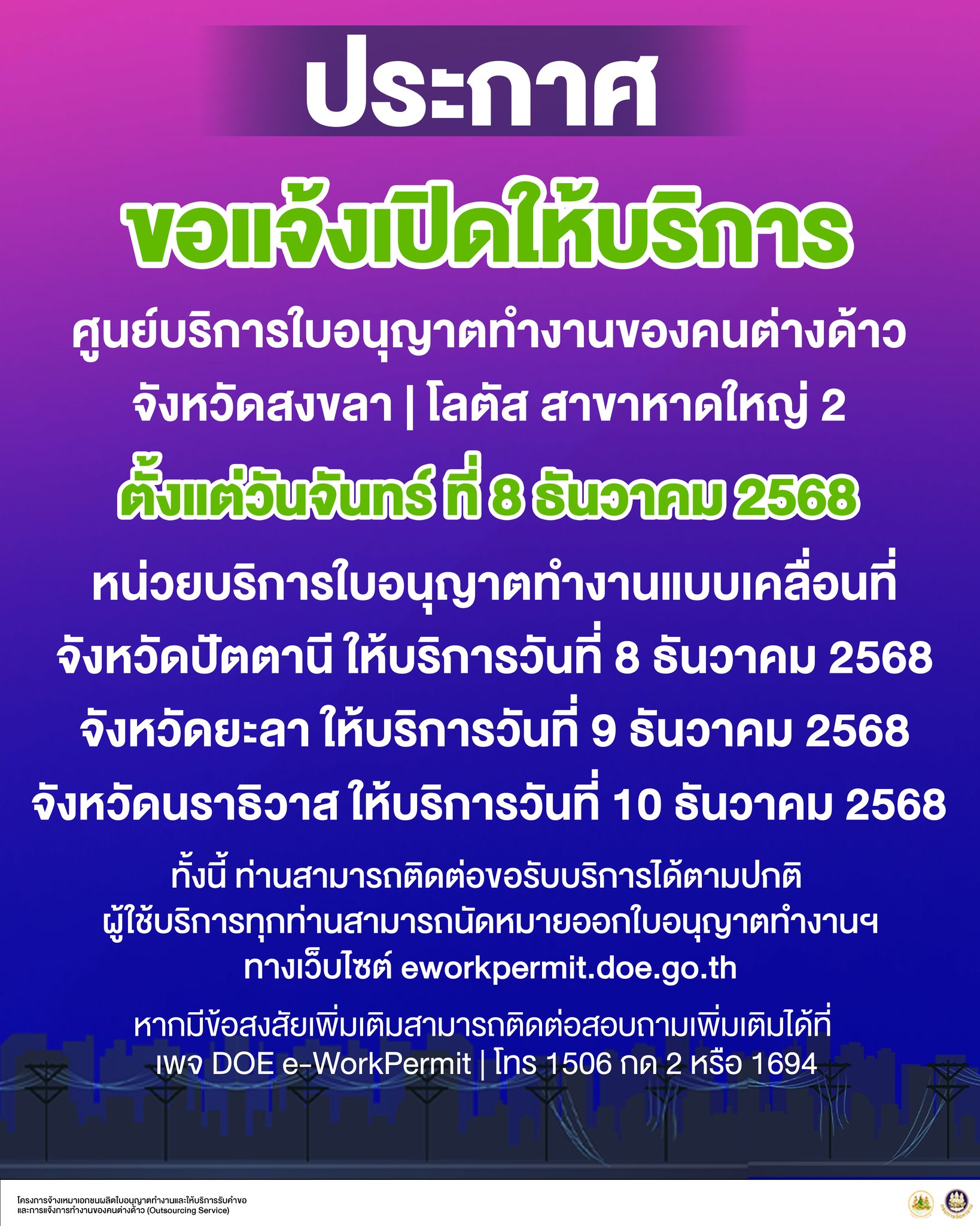 กรมการจัดหางาน แจ้งเปิดให้บริการศูนย์บริการใบอนุญาตทำงานของคนต่างด้าวในพื้นที่ภาคใต้ ตั้งแต่บัดนี้เป็นต้นไป