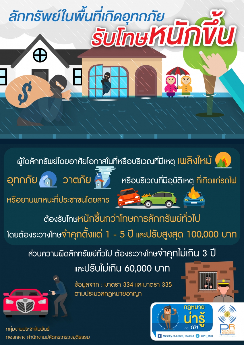 กระทรวงยุติธรรม แจ้งเตือนกฎหมายน่ารู้ ตอน ลักทรัพย์ในพื้นที่เกิดอุทกภัย รับโทษหนักขึ้น ข่าวสารกิจกรรม, สาธารณภัย กระทรวงยุติธรรม แจ้งเตือนกฎหมายน่ารู้ ตอน ลักทรัพย์ในพื้นที่เกิดอุทกภัย รับโทษหนักขึ้น กระทรวงยุติธรรม แจ้งเตือนกฎหมายน่ารู้เกี่ยวกับความผิดฐานลักทรัพย์ในช่วงเกิดอุทกภัย โดยระบุว่าผู้ใดลักทรัพย์โดยอาศัยโอกาสในพื้นที่ที่เกิดเหตุเพลิงไหม้ อุทกภัย วาตภัย หรือในบริเวณที่เกิดอุบัติเหตุแก่รถไฟหรือยานพาหนะที่ประชาชนโดยสาร จะได้รับโทษหนักขึ้นกว่าความผิดลักทรัพย์ทั่วไป โดยกำหนดโทษจำคุกตั้งแต่ 1 – 5 ปี และปรับสูงสุด 100,000 บาท ขณะที่ความผิดลักทรัพย์ทั่วไปมีโทษจำคุกไม่เกิน 3 ปี และปรับไม่เกิน 60,000 บาท กระทรวงยุติธรรม แจ้งเตือนกฎหมายน่ารู้ ตอน ลักทรัพย์ในพื้นที่เกิดอุทกภัย รับโทษหนักขึ้น ผู้ใดลักทรัพย์ โดยอาศัยโอกาสในที่หรือบริเวณที่มีเหตุ เพลิงไหม้ อุทกภัย วาตภัย หรือบริเวณที่มีอุบัติเหตุ ที่เกิดแก่รถไฟหรือยานพาหนะที่ประชาชนโดยสาร ต้องรับโทษหนักขึ้นกว่าโทษการลักทรัพย์ทั่วไป ต้องระวางโทษจำคุกตั้งแต่ 1 – 5 ปี และปรับสูงสุด 100,000 บาท ส่วนความผิดลักทรัพย์ทั่วไป ต้องระวางโทษจำคุกไม่เกิน 3 ปีและปรับไม่เกิน 60,000 บาท ข้อมูลจาก : มาตรา 334 และมาตรา 335 ตามประมวลกฎหมายอาญา ที่มา : Facebook กระทรวงยุติธรรม Ministry Of Justice, Thailand Post Views: 148 FacebookFacebookXTwitterLINELine