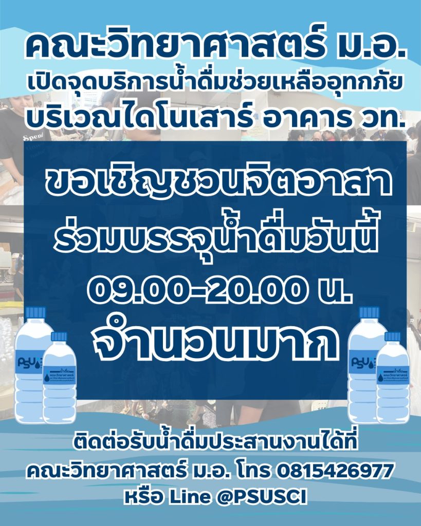 คณะวิทยาศาสตร์ มหาวิทยาลัยสงขลานครินทร์ ขอเชิญชวน จิตอาสาร่วมบรรจุน้ำดื่ม เพื่อช่วยเหลือผู้ประสบอุทกภัย ให้บริการเวลา 09.00 – 20.00 น. ณ บริเวณ ไดโนเสาร์ อาคาร วท. สนใจร่วมเป็นจิตอาสา หรือขอรับน้ำดื่มเพื่อช่วยกระจายในพื้นที่ สามารถติดต่อได้ที่ โทร. 08 1542 6977 หรือ Line: @PSUSCI