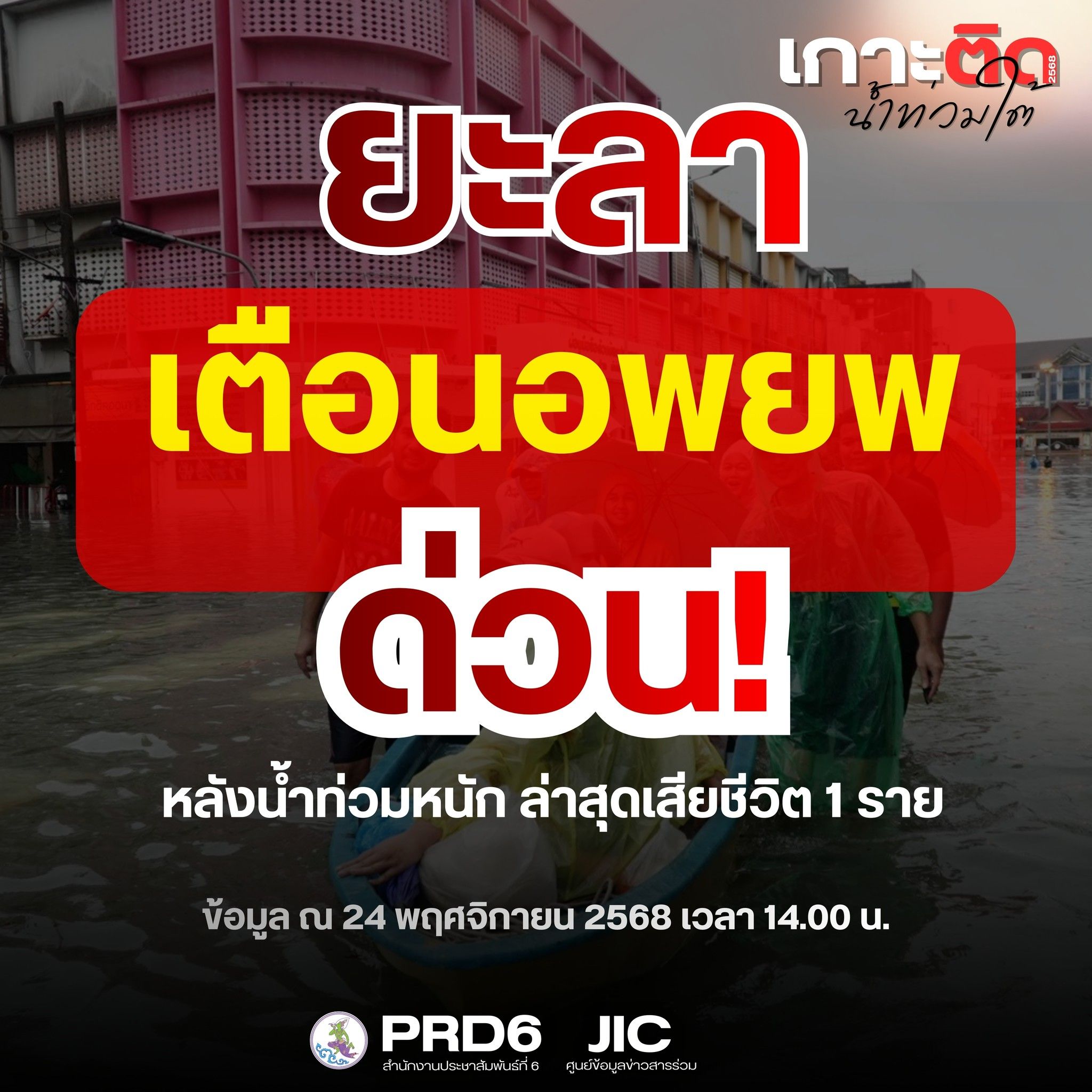 (24 พ.ย. 68) สถานการณ์อุทกภัยในพื้นที่จังหวัดยะลาเข้าขั้นวิกฤต หลังฝนตกลงมาอย่างหนักติดต่อกันตั้งแต่วันที่ 20 พ.ย. ส่งผลให้มวลน้ำสะสมจำนวนมากจากเทือกเขาบอยอ ไหลบ่าลงสู่คลองแบเมาะและแม่น้ำปัตตานี จนเอ่อล้นเข้าท่วมพื้นที่ลุ่มต่ำและเขตเศรษฐกิจสำคัญ
