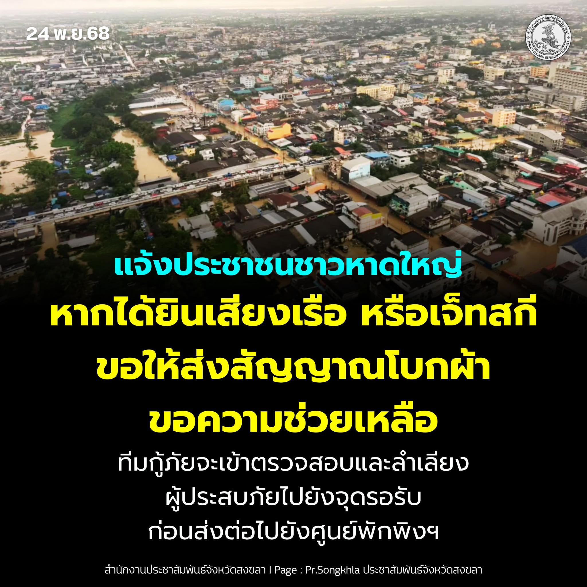 จังหวัดสงขลา เเจ้งประชาชนขอให้โบกผ้าขอความช่วยเหลือทีมกู้ภัย ข่าวสารกิจกรรม, สาธารณภัย จังหวัดสงขลา เเจ้งประชาชนขอให้โบกผ้าขอความช่วยเหลือทีมกู้ภัย เเจ้งประชาชนชาวหาดใหญ่หากได้ยินเสียงเรือหรือเจ็ทสกี ขอให้โบกผ้าขอความช่วยเหลือทีมกู้ภัยจะเข้าตรวจสอบและลำเลียงผู้ประสบภัยไปยังจุดรอรับ ก่อนส่งต่อไปยังศูนย์พักพิงฯ ต่อไป ที่มา : facebook : Pr.Songkhla ประชาสัมพันธ์จังหวัดสงขลา Post Views: 18 FacebookFacebookXTwitterLINELine
