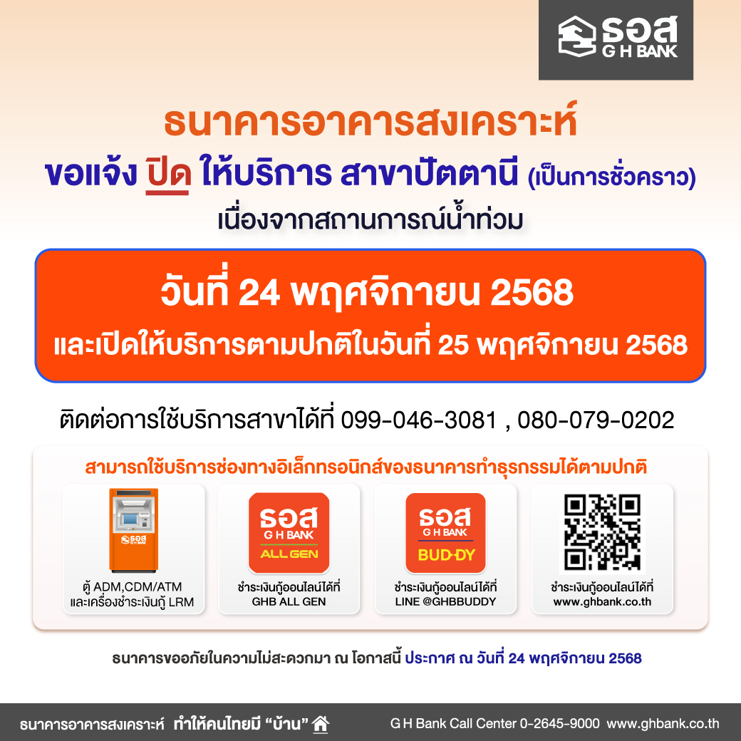 ธนาคารอาคารสงเคราะห์ แจ้งปิดให้บริการสาขาปัตตานี (เป็นการชั่วคราว) วันที่ 24 พฤศจิกายน 2568 ข่าวสารกิจกรรม, สาธารณภัย ธนาคารอาคารสงเคราะห์ แจ้งปิดให้บริการสาขาปัตตานี (เป็นการชั่วคราว) วันที่ 24 พฤศจิกายน 2568 ธนาคารอาคารสงเคราะห์ แจ้งปิดให้บริการสาขาปัตตานี (เป็นการชั่วคราว) เนื่องจากสถานการณ์น้ำท่วมปิดให้บริการ วันที่ 24 พฤศจิกายน 2568เปิดให้บริการตามปกติ วันที่ 25 พฤศจิกายน 2568สามารถติดต่อใช้บริการสาขาได้ที่ โทร. 09 9046 3081 , 08 0079 0202ธนาคารขออภัยในความไม่สะดวกมา ณ โอกาสนี้ประกาศ ณ วันที่ 24 พ.ย. 68สอบถามข้อมูลเพิ่มเติมได้ที่Inbox : m.me/GHBankG H BANK Call Center : 0-2645-9000ธอส. ทุกสาขาทั่วประเทศ : http://bit.ly/2MkPK64 ที่มา : Facebook ธนาคารอาคารสงเคราะห์ Post Views: 7 FacebookFacebookXTwitterLINELine