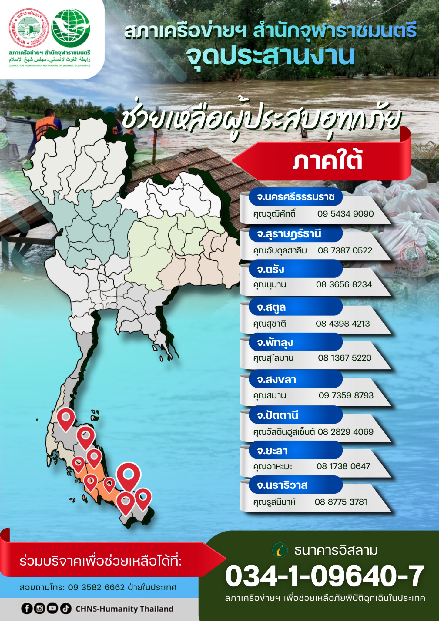 สภาเครือข่ายช่วยเหลือด้านมนุษยธรรม สำนักจุฬาราชมนตรี ขอเชิญร่วมบริจาคช่วยเหลือผู้ประสบอุทกภัยภาคใต้