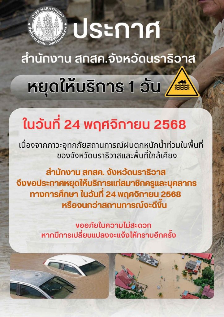 สำนักงาน สกสค. จังหวัดภาคใต้ แจ้งหยุดให้บริการ ตั้งแต่วันที่ 24 พ.ย. 68 ไปจนกว่าสถานการณ์จะดีขึ้น