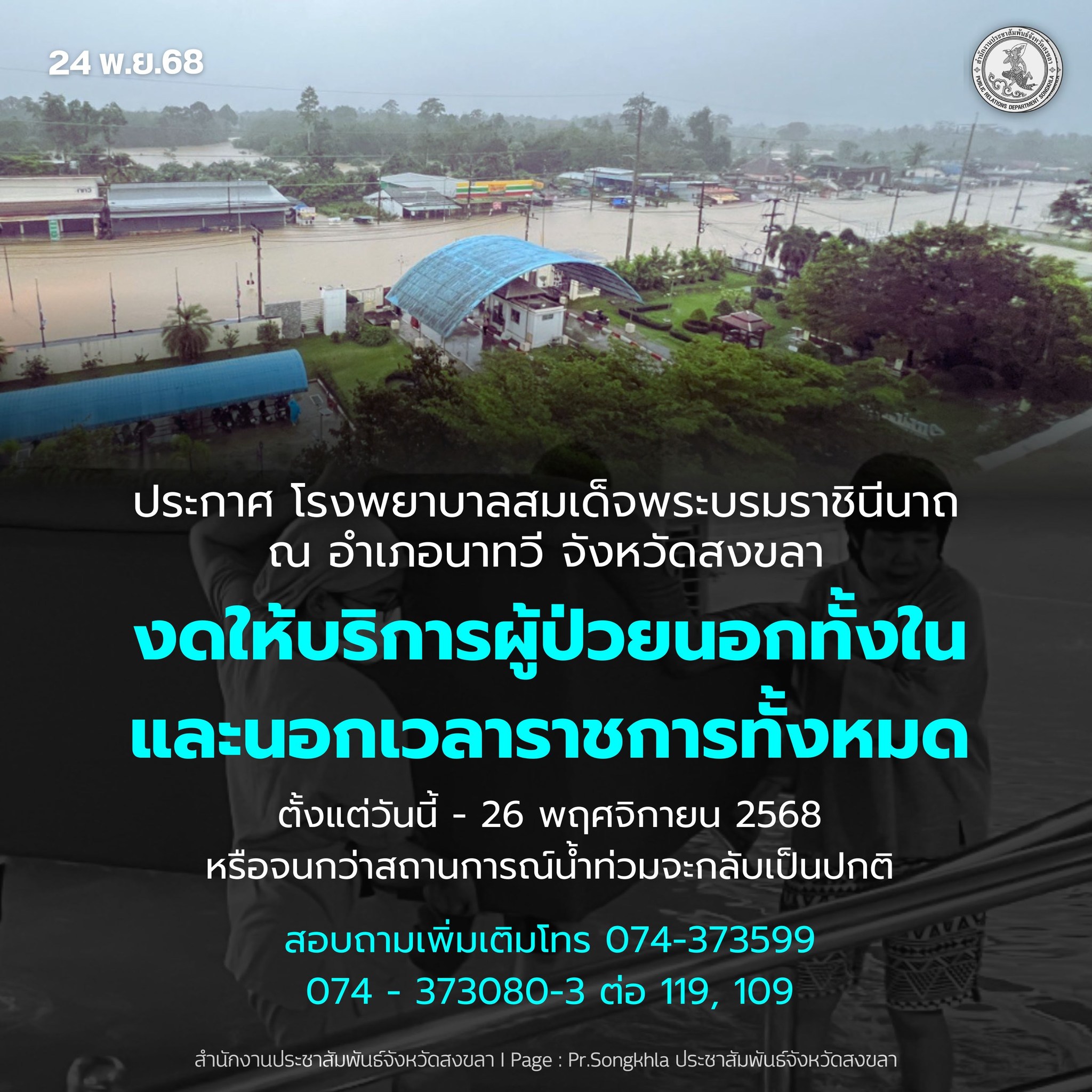 โรงพยาบาลสมเด็จพระบรมราชินีนาถ ณ อำเภอนาทวี จังหวัดสงขลา งดให้บริการผู้ป่วยนอก ข่าวสารกิจกรรม, สาธารณภัย โรงพยาบาลสมเด็จพระบรมราชินีนาถ ณ อำเภอนาทวี จังหวัดสงขลา งดให้บริการผู้ป่วยนอก โรงพยาบาลสมเด็จพระบรมราชินีนาถ ณ อำเภอนาทวี จังหวัดสงขลา งดให้บริการผู้ป่วยนอกทั้งใน และนอกเวลาราชการทั้งหมด ตั้งแต่วันนี้ – 26 พฤศจิกายน 2568 หรือจนกว่าสถานการณ์น้ำท่วมจะกลับเป็นปกติ สอบถามเพิ่มเติมโทร 074-373599, 0-7437-3080 ถึง 3 ต่อ 119, 109 ที่มา : facebook : Pr.Songkhla ประชาสัมพันธ์จังหวัดสงขลา Post Views: 10 FacebookFacebookXTwitterLINELine