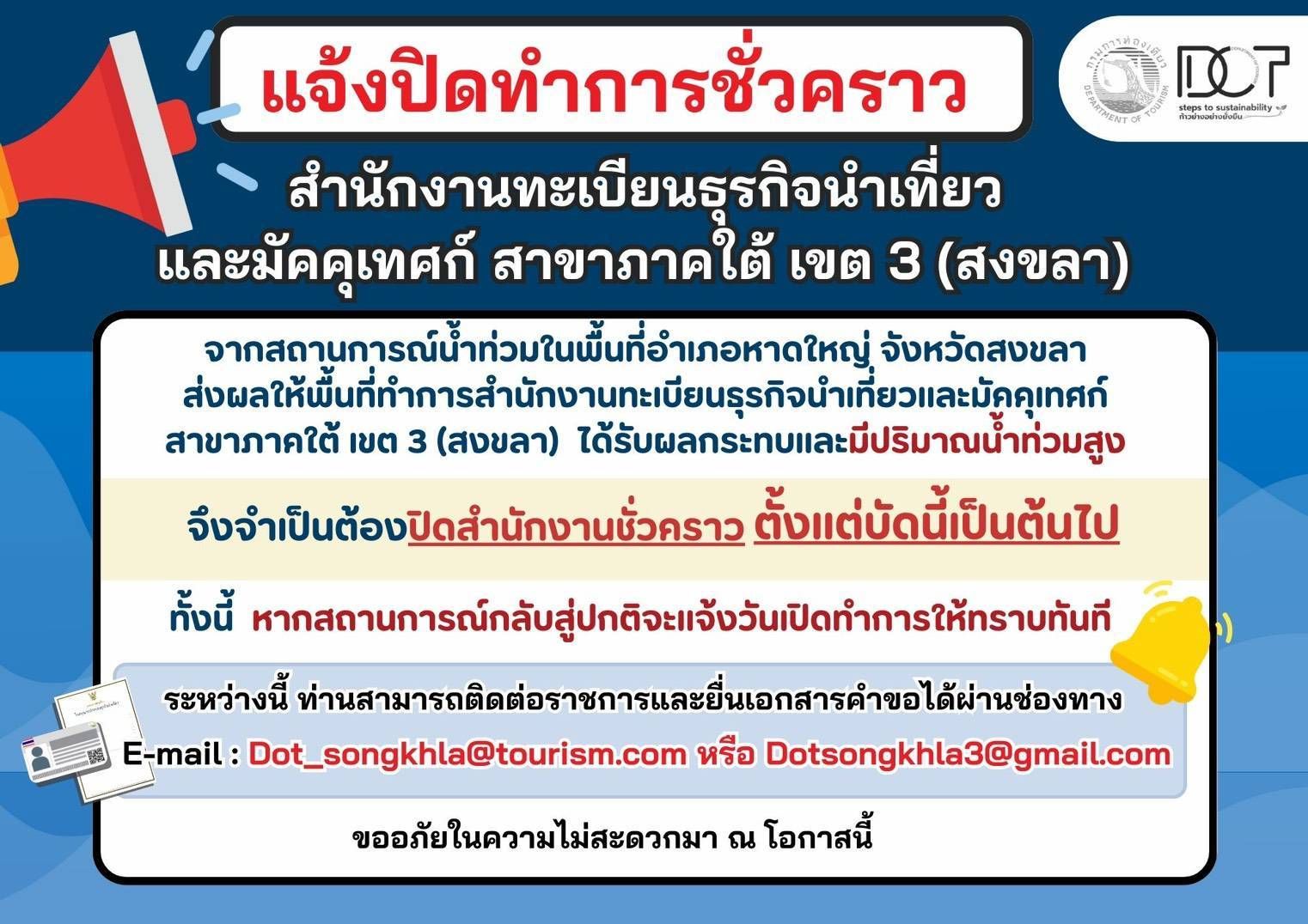 กรมการท่องเที่ยว แจ้งปิดสำนักงานทะเบียนธุรกิจนำเที่ยวและมัคคุเทศก์ เขต 3 จ.สงขลา เป็นการชั่วคราว ข่าวสารกิจกรรม, สาธารณภัย กรมการท่องเที่ยว แจ้งปิดสำนักงานทะเบียนธุรกิจนำเที่ยวและมัคคุเทศก์ เขต 3 จ.สงขลา เป็นการชั่วคราว กรมการท่องเที่ยว ขอแจ้งปิดที่ทำการสำนักงานทะเบียนธุรกิจนำเที่ยวและมัคคุเทศก์สาขาภาคใต้ เขต 3 (จ.สงขลา) เป็นการชั่วคราว จากสถานการณ์น้ำท่วมในจังหวัดสงขลา ส่งผลให้บริเวณพื้นที่ทำการสำนักงาน ฯ ได้รับผลกระทบ มีปริมาณน้ำท่วมสูง จึงจำเป็นต้องปิดสำนักงานฯ ชั่วคราว จนกว่าระดับน้ำจะลดลง ทั้งนี้ หากสถานการณ์กลับสู่ปกติ จะแจ้งวันเปิดทำการให้ทราบทันที สามารถติดต่อราชการได้ทางอีเมล E-mail : Dot_songkhla@tourism.go.th หรือ Dotsongkhla3@gmail.com ที่มา : Facebook กรมการท่องเที่ยว Department of Tourism Post Views: 6 FacebookFacebookXTwitterLINELine